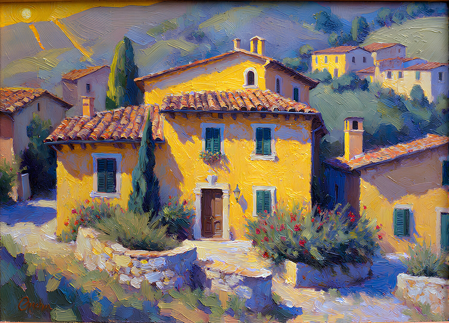 黄土色の家に太陽が降り注ぐ、明るい雰囲気の風景です。