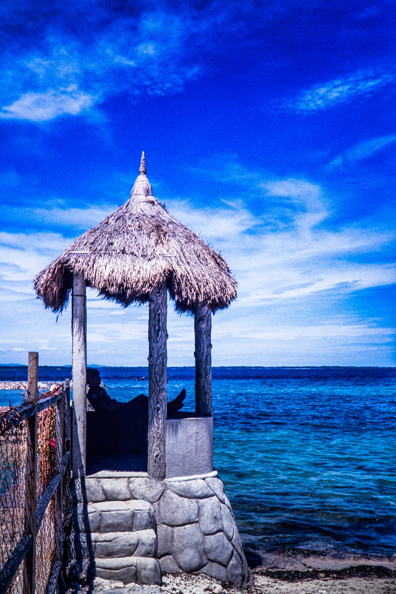 フィリピン、セブ島のビーチ。プライベートビーチとパブリックビーチはフェンスで仕切られ監視小屋が設置されている。古屋の中には居眠りする人影が見える。南の島の時間は気だるく流れていく。