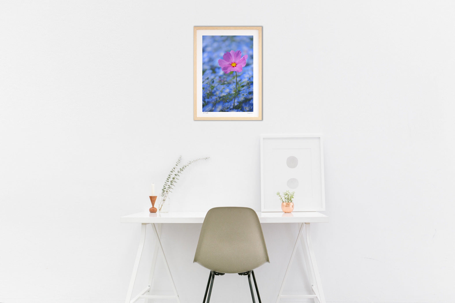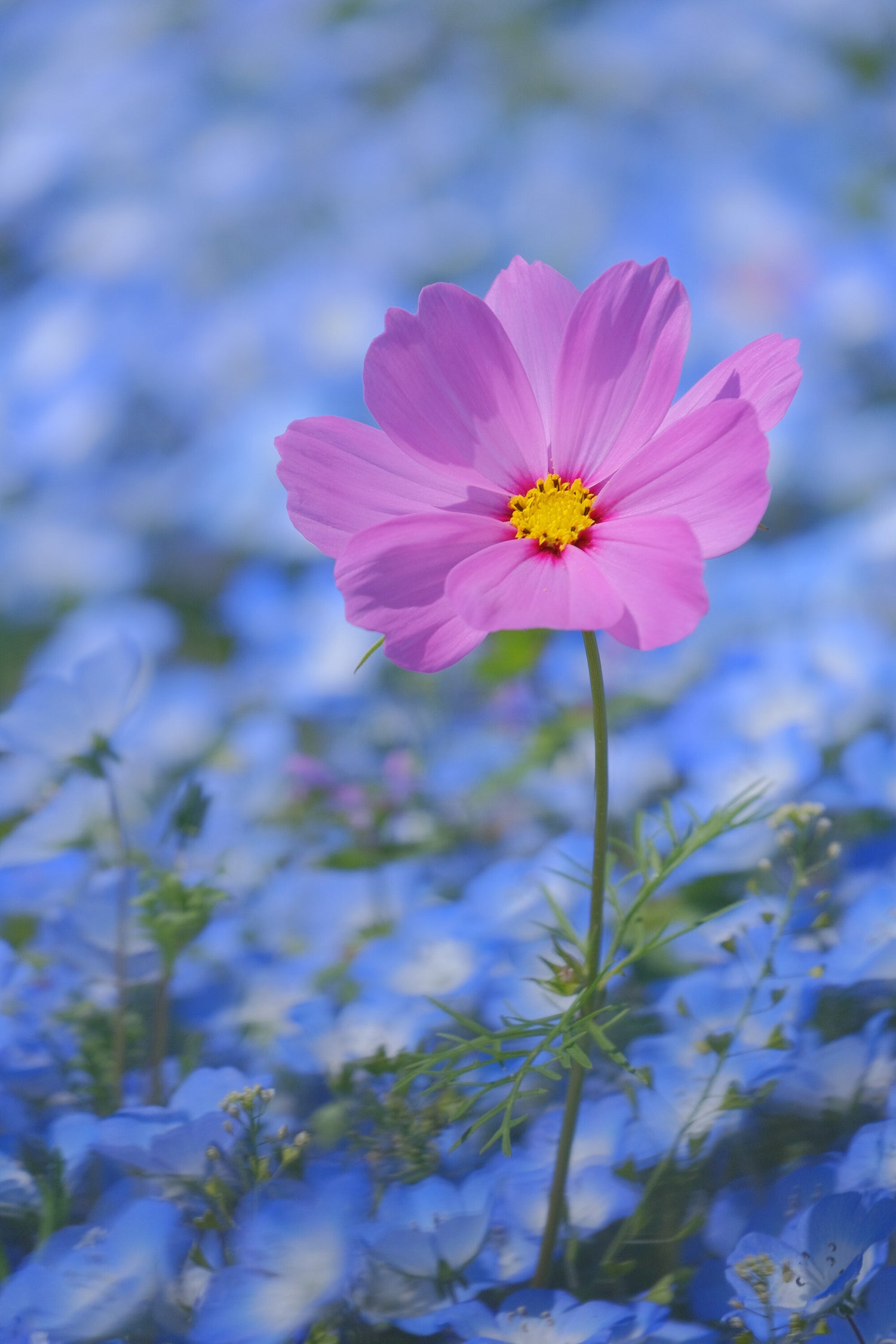 青いネモフィラの絨毯の中に場違いなように背を伸ばし花を咲かせるコスモス。