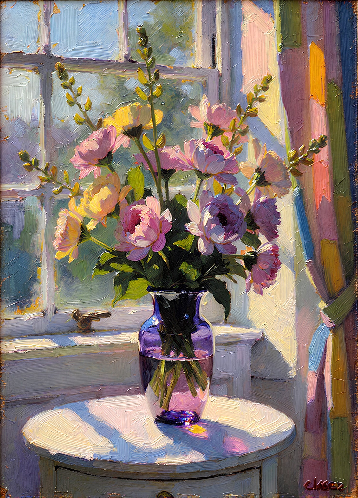色のついたガラスの花瓶にパステルカラーの花々が挿されている。