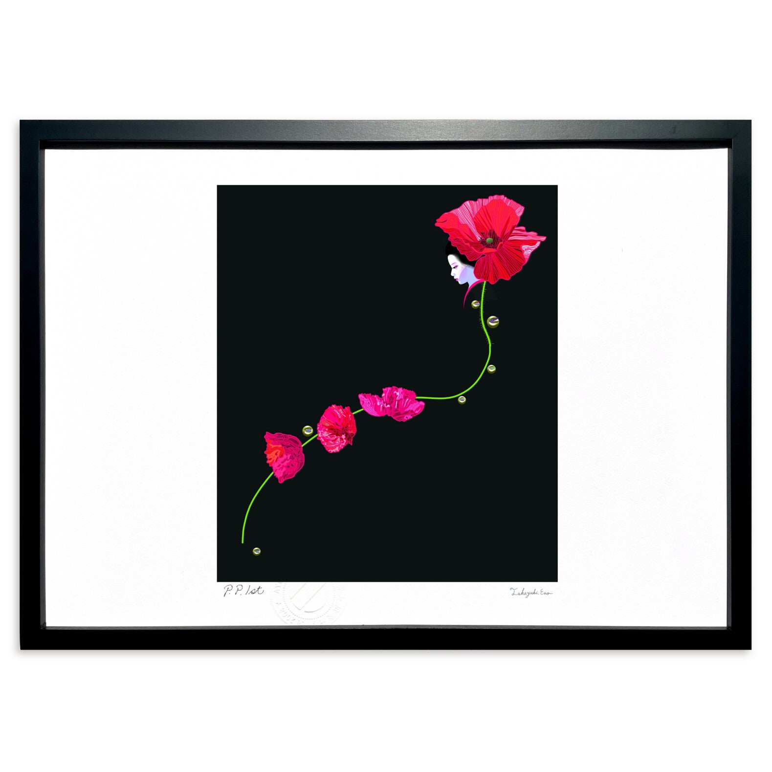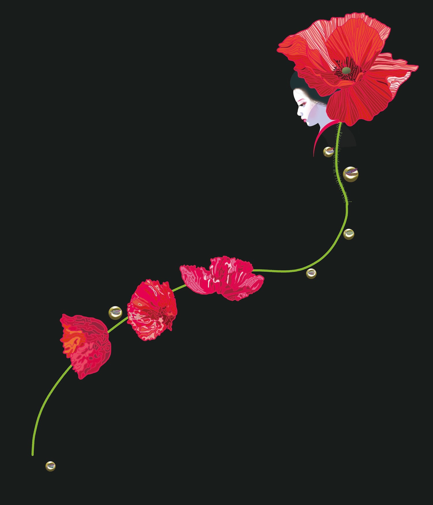 ブラックベースに赤いヒナゲシと和装の女性の印象的な色彩対比
