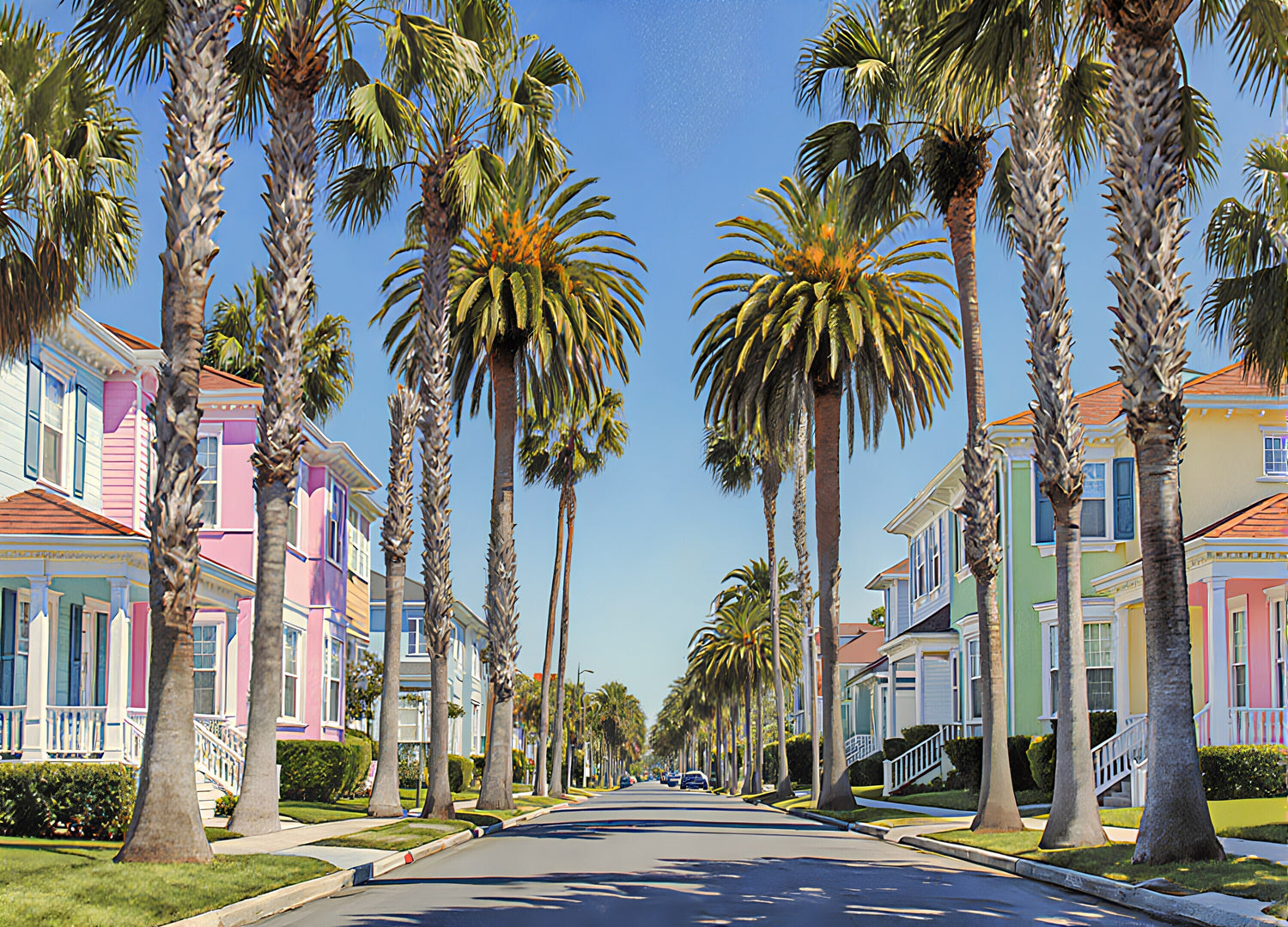 ヤシの木、パステルカラーの家々、澄み切った青空が広がる陽光あふれる郊外の路