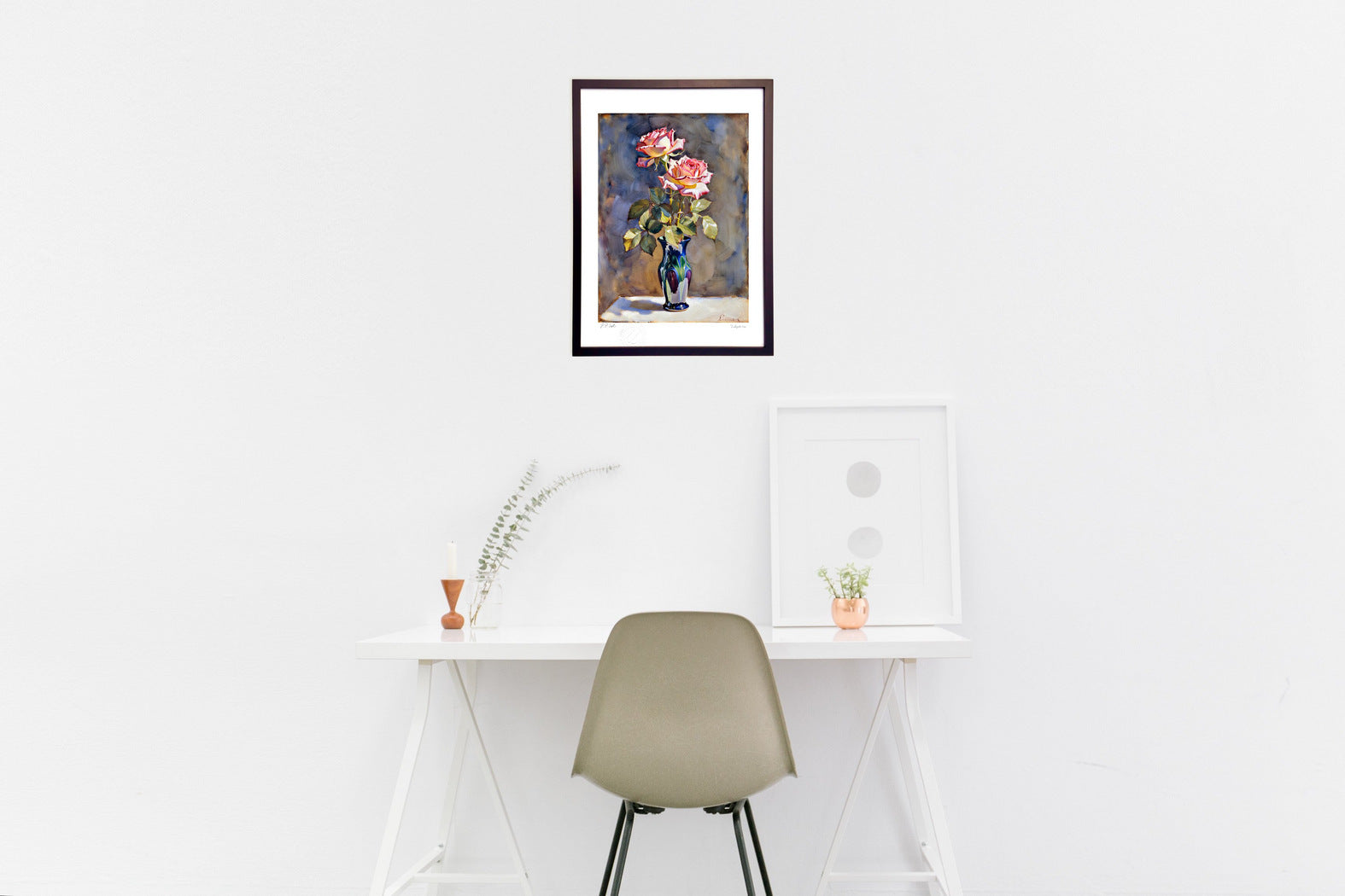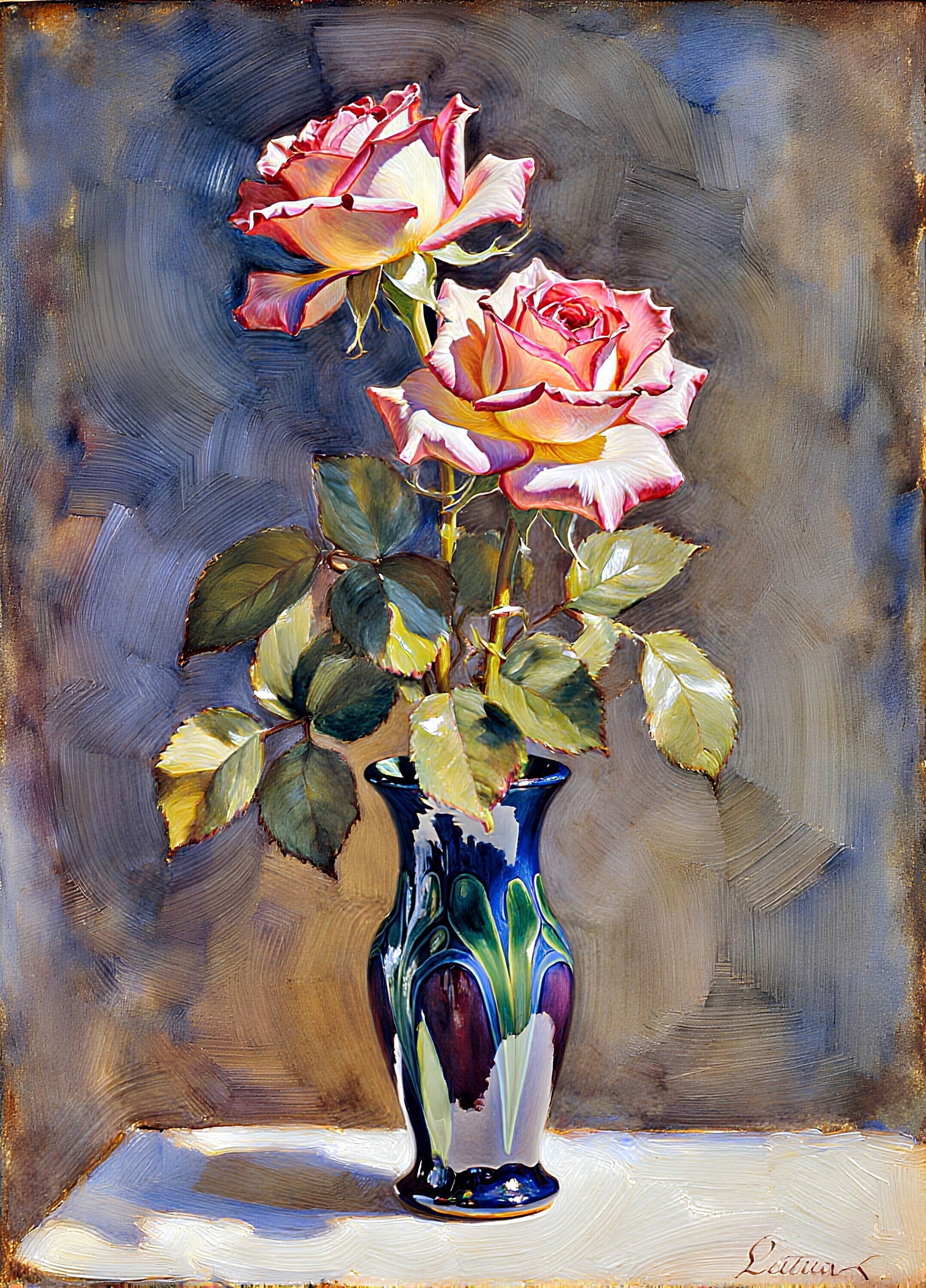 カップが浅めのバラがアール・ヌーヴォー風の花瓶に生けられています。