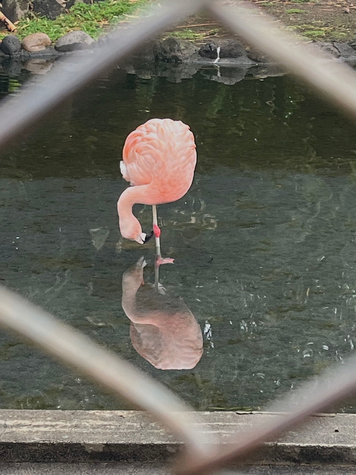 フェンスの隙間から眺めると水面に映る妖艶なフラミンゴに出会えた