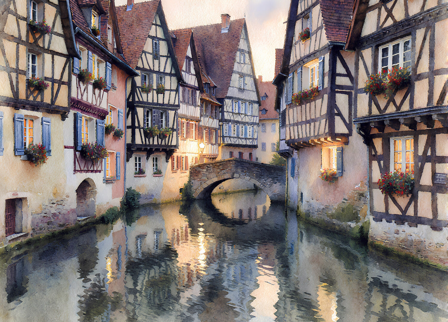 パステルカラーの木組みの家が水面に映り、おとぎ話の世界に迷い込んだような、優しい多幸感に包まれます。