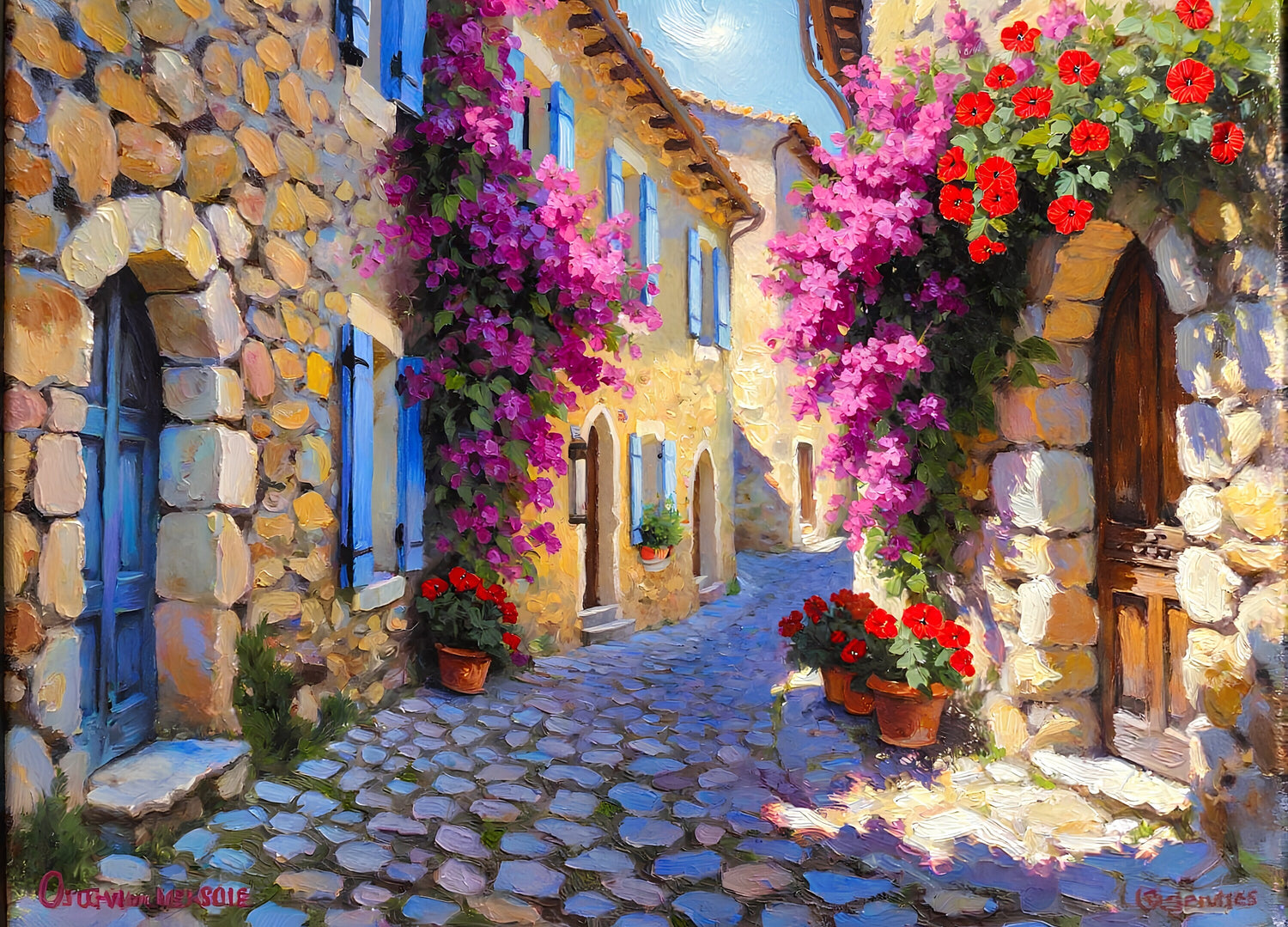 古い木製のドアと鉢植えのゼラニウムが素朴な魅力を添えています。