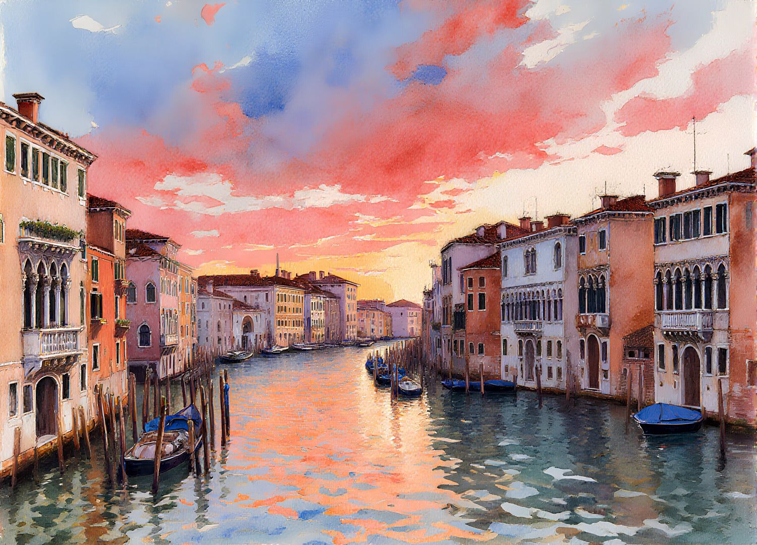 秋のベネチアの夕暮れの風景です。空が赤く青く染まっています。