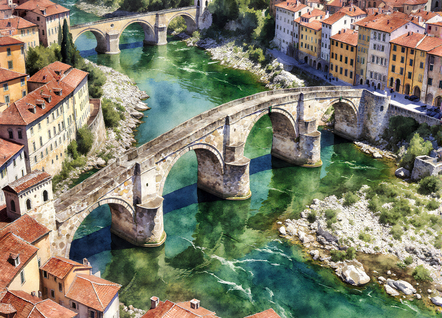 ボスニアのネレトヴァ川に架かるアーチ状のスタリ・モスト。オスマン帝国時代の古い街並み。