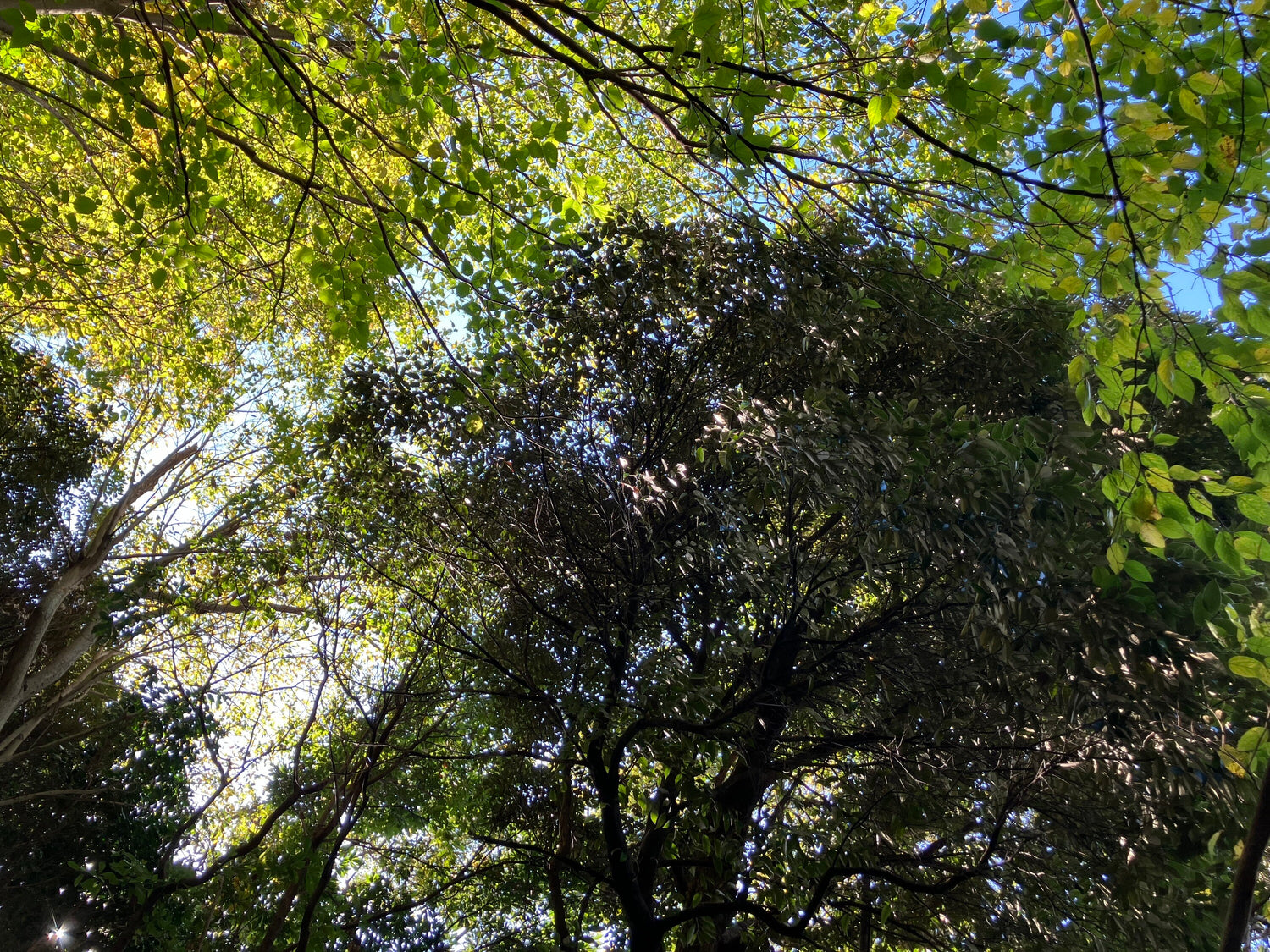 様々な色の葉っぱ。太陽の光、反射、影。葉の大きさも種類も様々。
