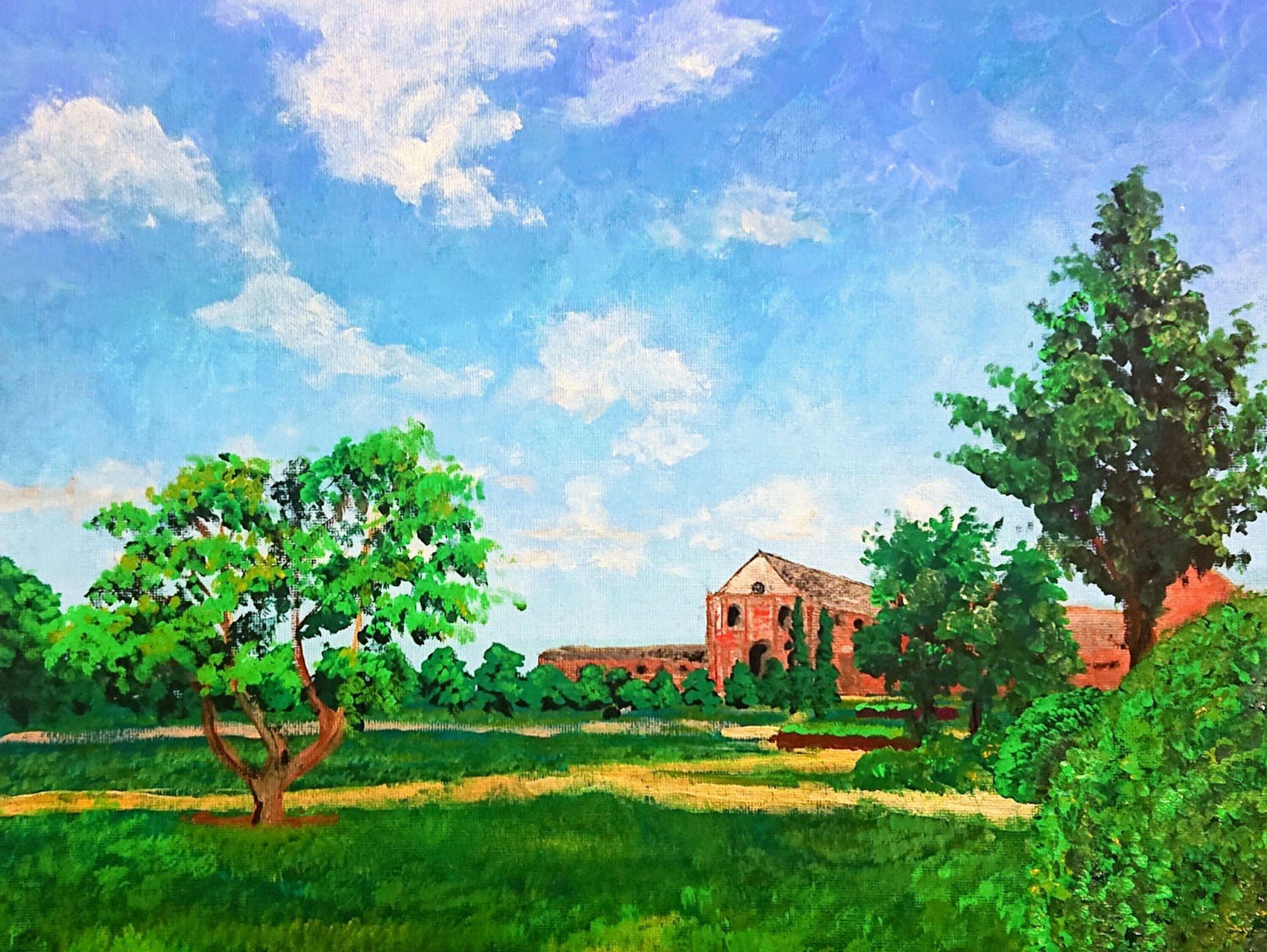 新緑が目にまぶしい5月。明治時代に建てられたレンガ造りの重厚な建物と緑のコントラストがとても美しく感じられました。散歩してみたくなる風景を描きました。