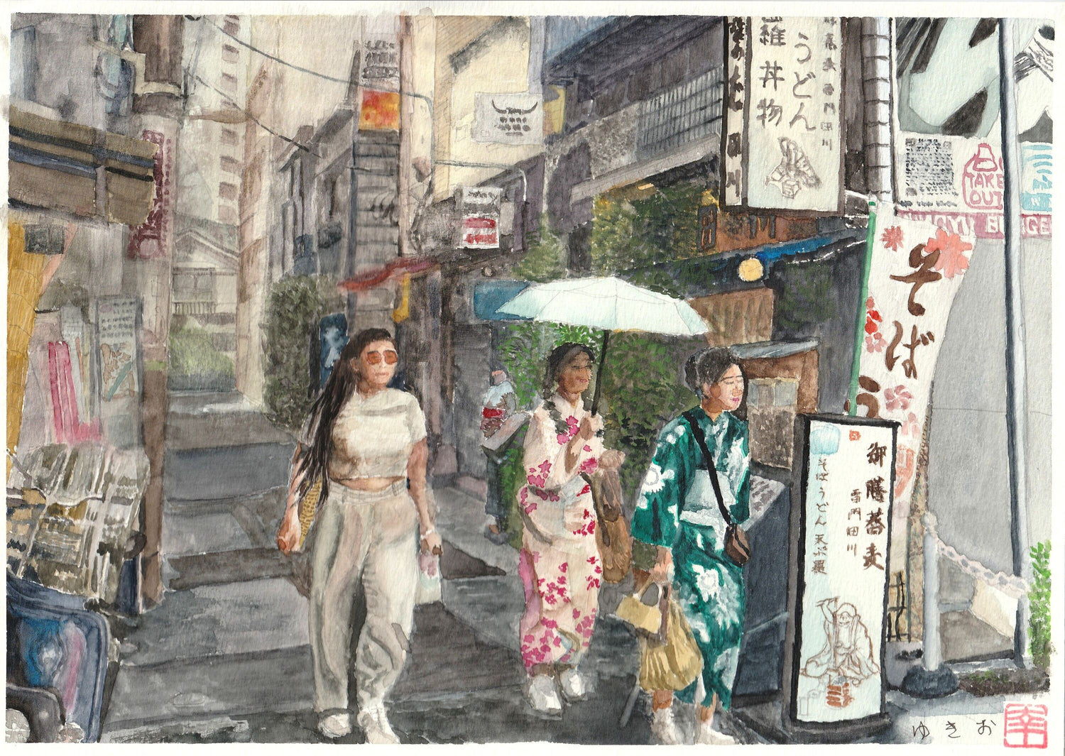 スニーカー、肩掛けバッグ、手荷物沢山 おそらくレンタル着物での外人かと思われます。
