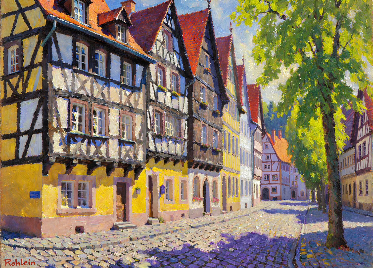 木骨造りの家々は鮮やかな黄色と白の原色で描かれ、ダークウッドの梁が特徴的です。