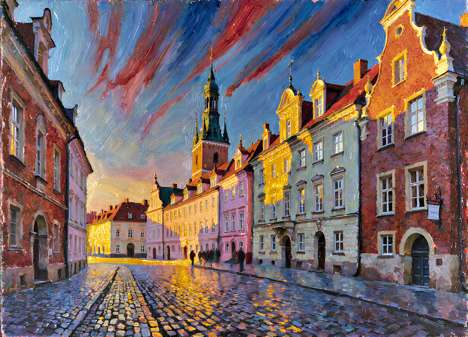 金色の光が赤レンガの建物と石畳の通りに温かみのある輝きを放っている。