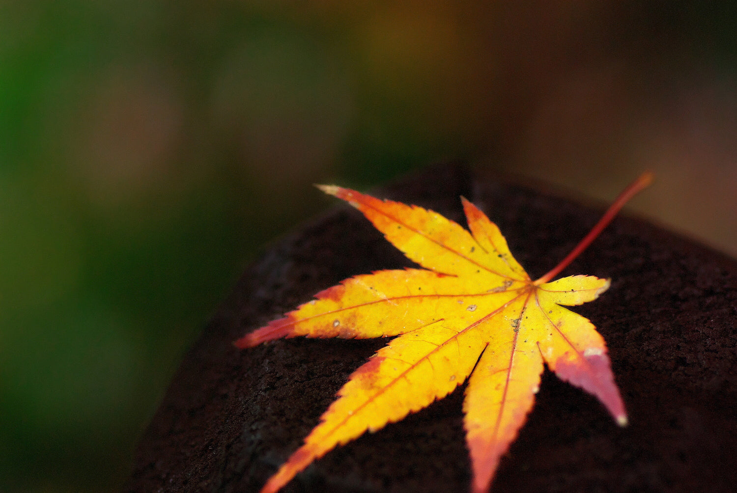 この写真は、落ちた一枚のもみじを静かに捉えています。黄色から橙、赤へと色づく葉は、秋の終わりを告げるようにも感じられます。背景の柔らかなボケ感と共に、静寂の中にある季節の美を表現しています。