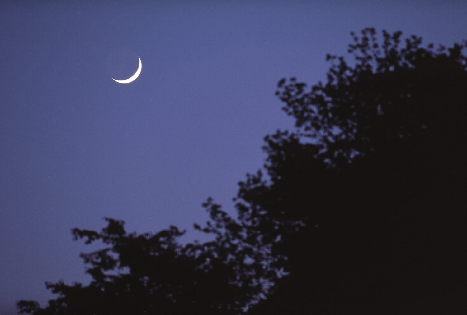 済んだ宵の空に浮かんだ三日月。地上の木を取り込んで画面を構成。