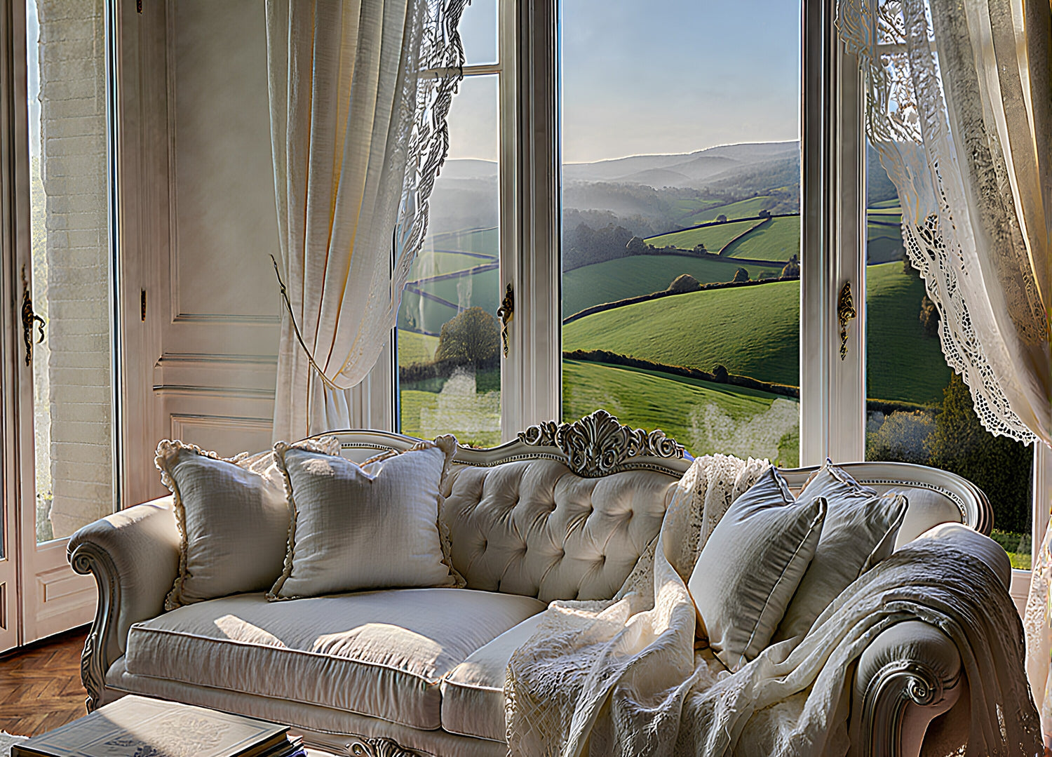 霧のかかったなだらかな丘陵地帯を見下ろす大きな窓
