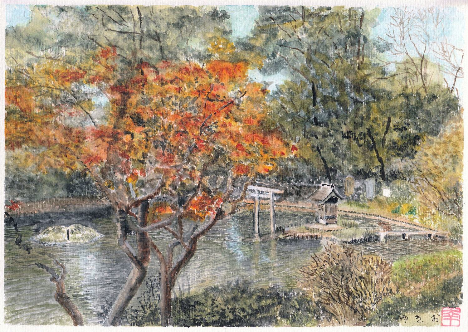越谷市久伊豆神社境内の池 今年はもみじの色づきが綺麗です。