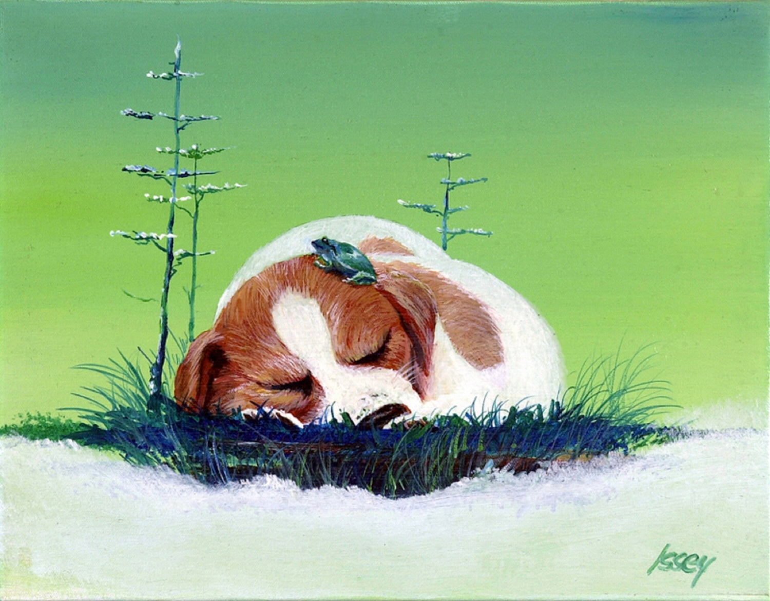 朝露にまみれて遊びほうけた子犬・・・・、疲れて眠る・・頭にカエル。