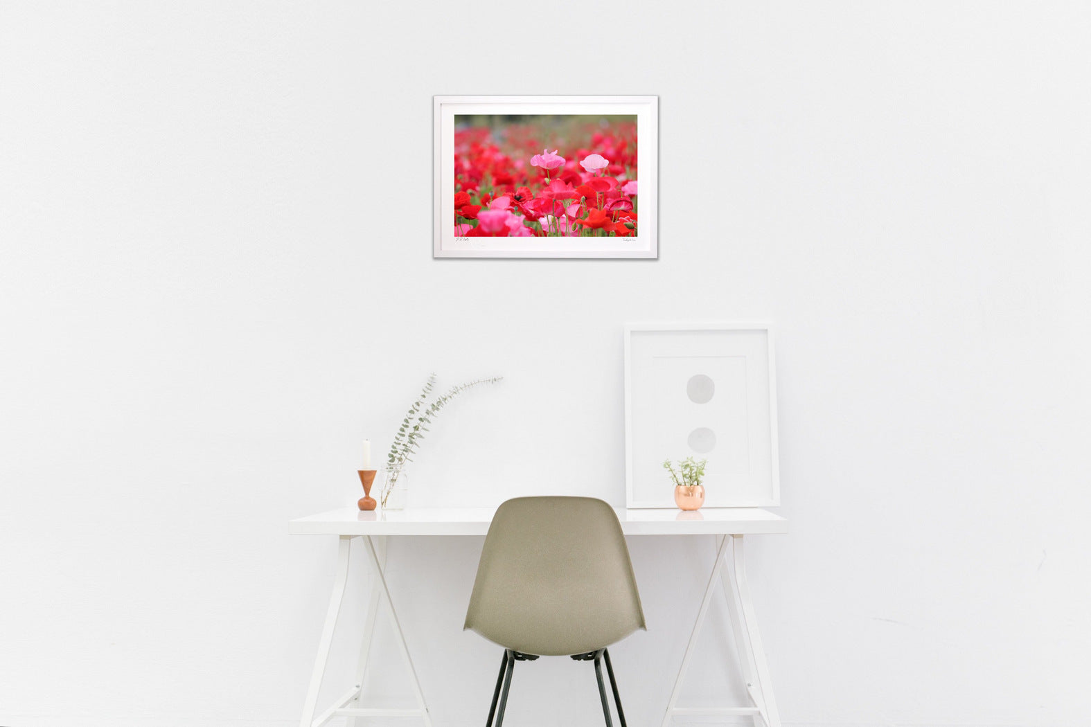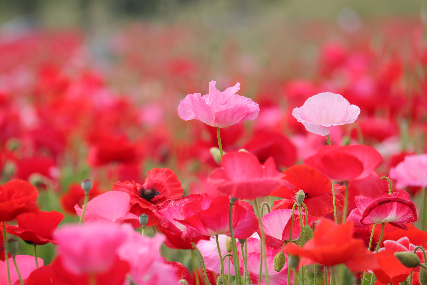 春の陽射しを浴びて、ピンクや赤のポピーが風に揺れる光景を捉えました。