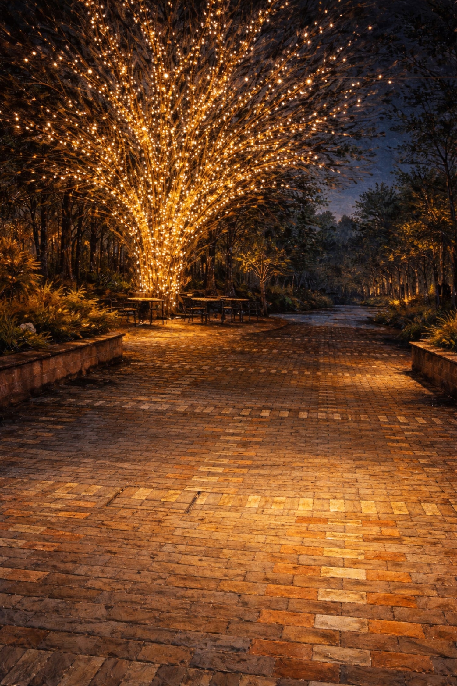 レンガの小径へ落ちるやわらかな光が、静けさの中にぬくもりを生み、歩みをゆっくりと誘います。