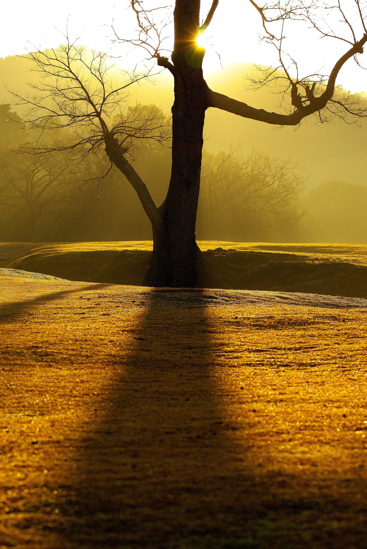 奈良公園の飛火野園地に佇む一本のナンキンハゼ。その幹をすり抜ける朝日が、静かな大地に長い影を描き出す瞬間を捉えた一枚です。冬枯れの木々と柔らかな朝の光が織りなす風景は、まるで時間が止まったかのような静寂と神聖さを感じさせます。鹿の聖地としても知られる飛火野は、朝の散策にぴったりの癒しの空間。この写真は、そんな一日の始まりに訪れる小さな奇跡のような光景を伝えています。