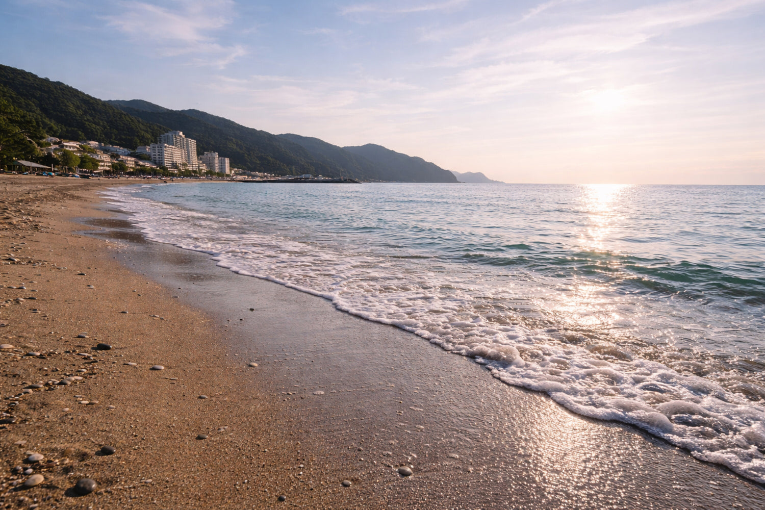 寄せては返す波が、朝の光をそっと抱く。