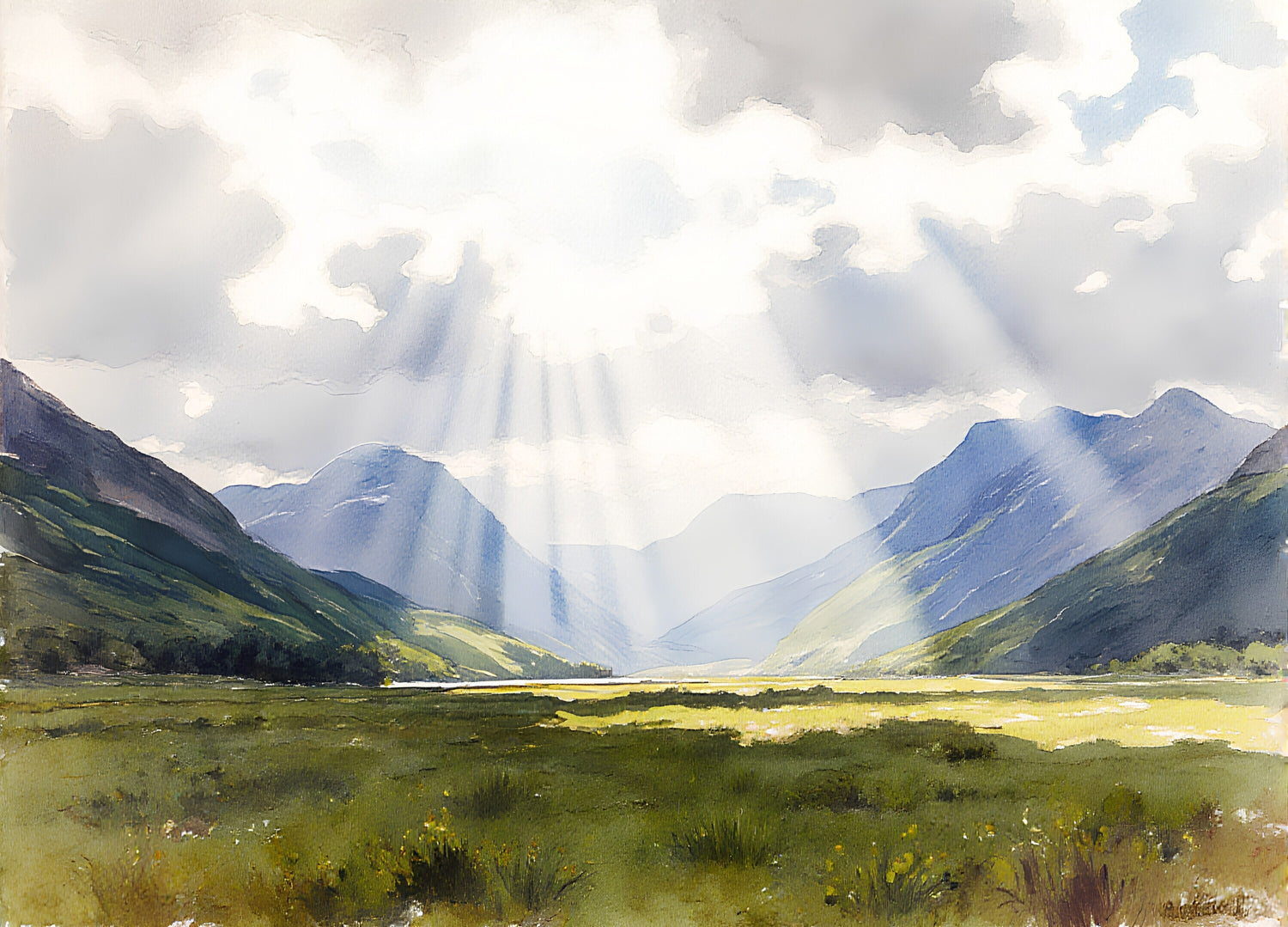初夏の草原の雨上がり、白い薄明光線(光芒)が草原に降り注いでいます。