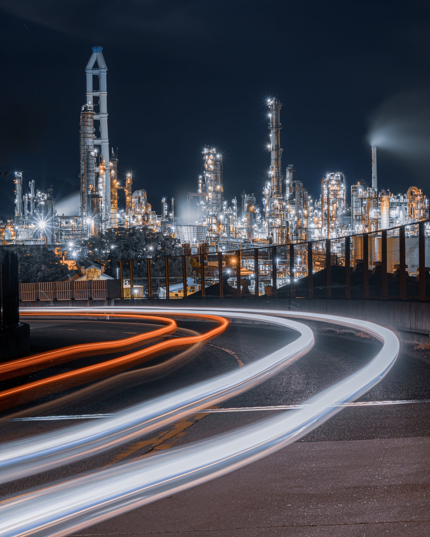 和歌山の工場です。車の光跡は自分で往復をして、テールランプ、ヘッドライトの光跡を撮影しました!!