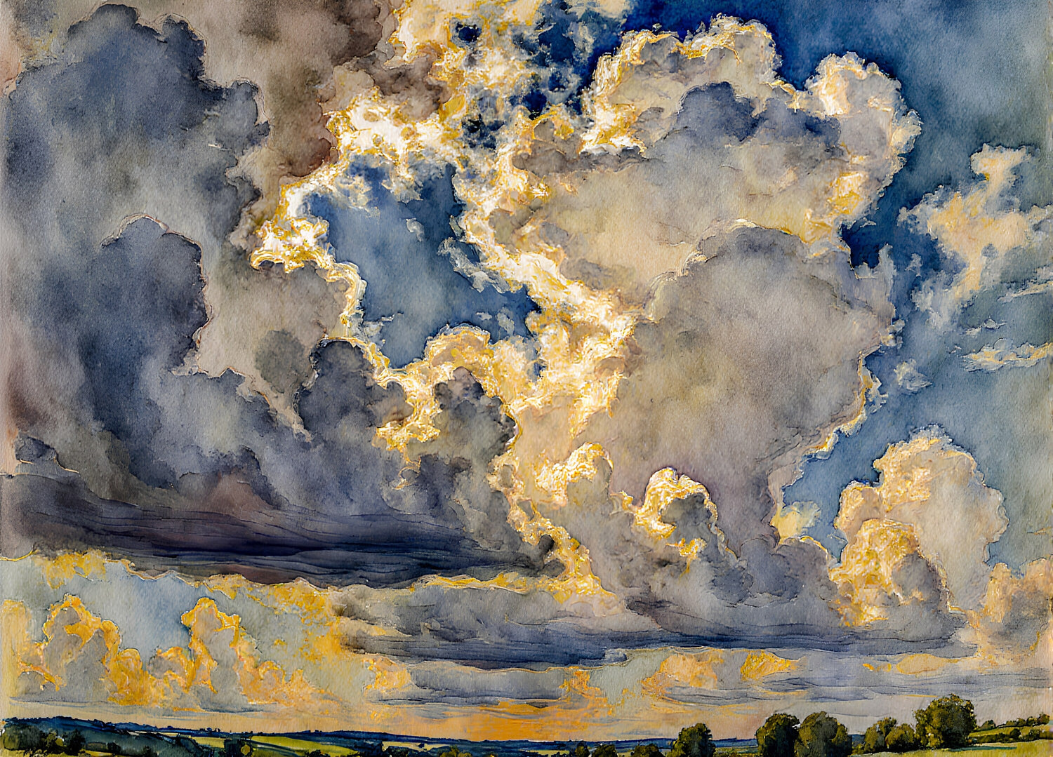 初夏の夕方、大きな入道雲が夕日に照らされて、少し黄色くなっています。