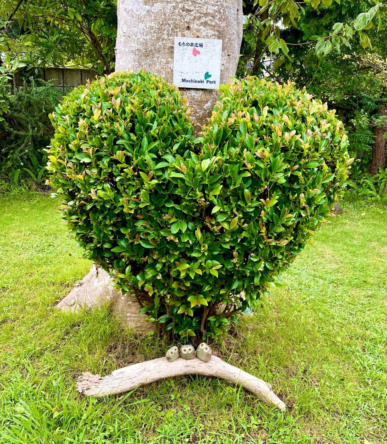大きく綺麗なカットされたハート型の植木の下には、3匹のフクロウが楽しそうにお喋りをしています。