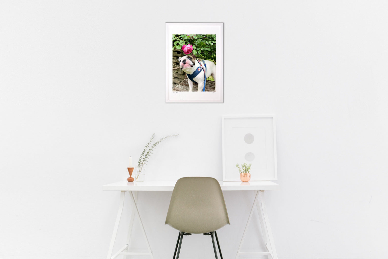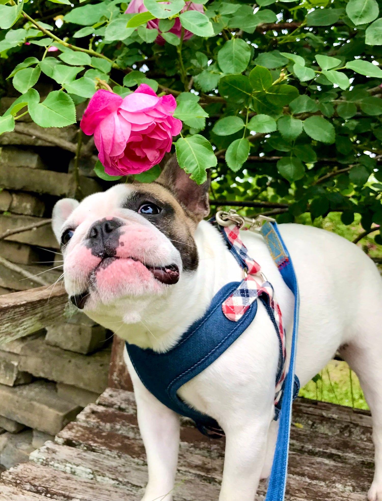 犬のフレンチブルドックが、あたりに漂う甘い花の匂いが気になって、匂いの元をたどって、バラの花にたどり着いた瞬間の写真です。