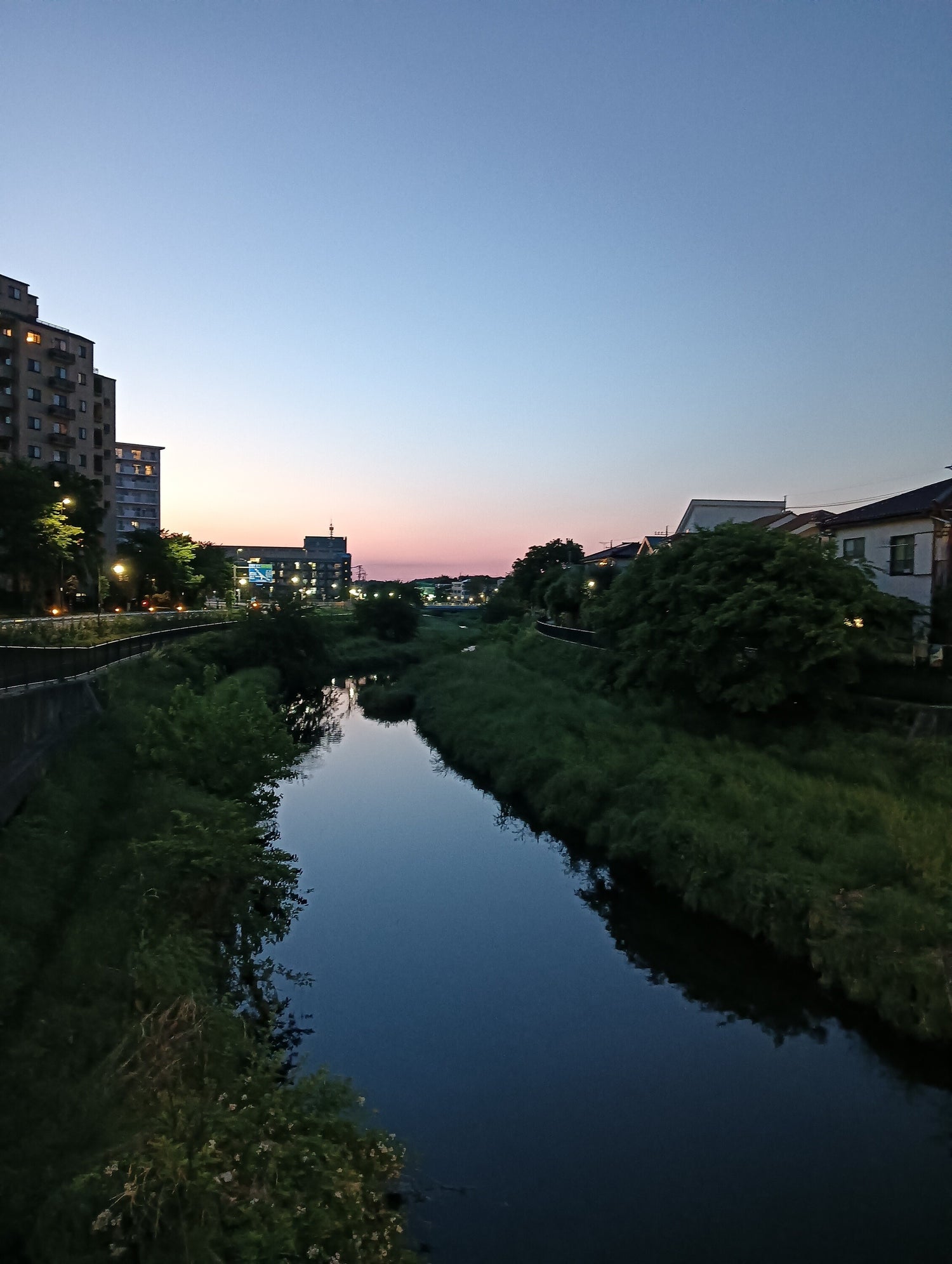 夕方、いつものように川沿いを散歩していたら、青とピンクが重なったカクテルのような夕日が見えた。