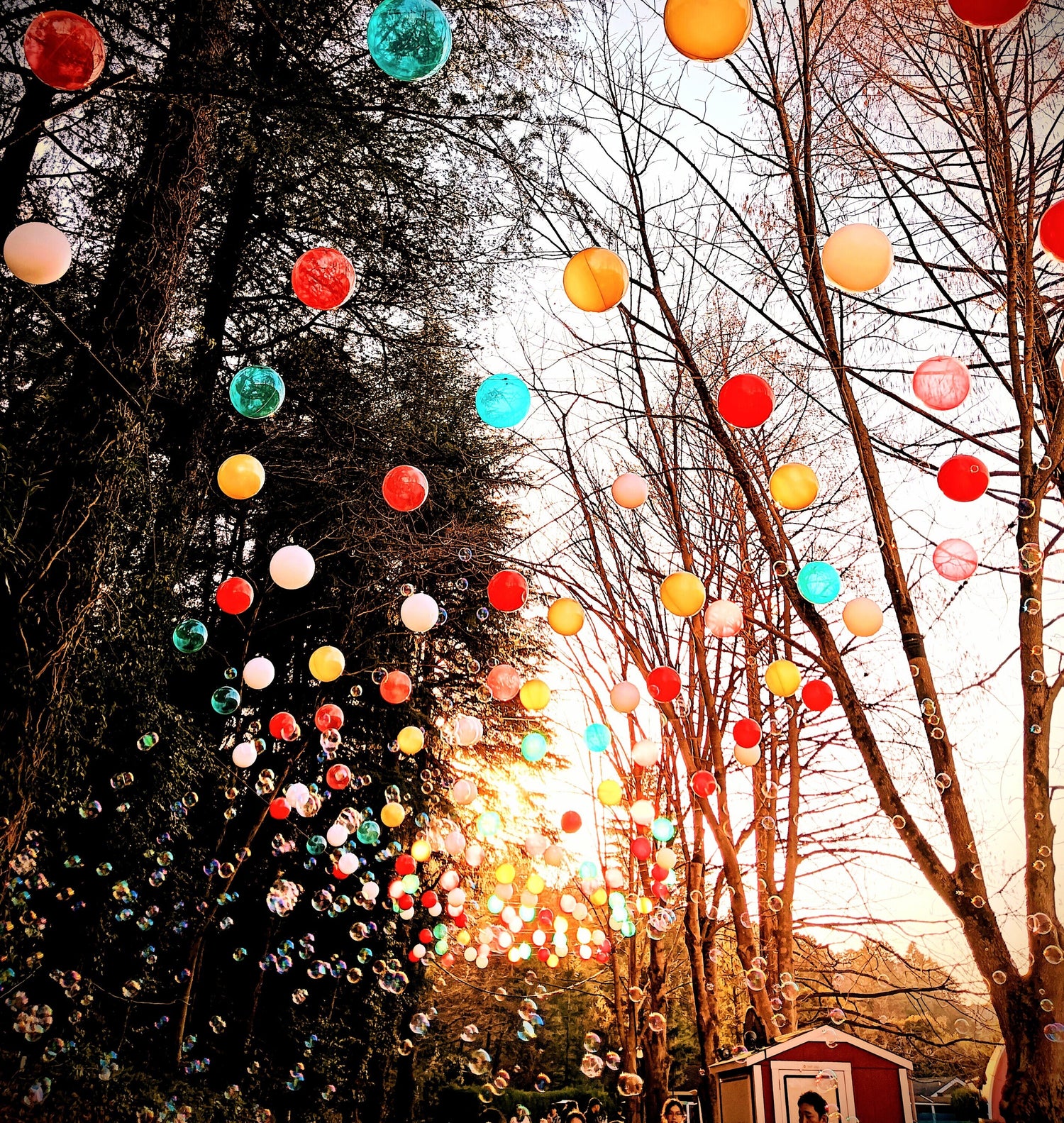 木々の間に浮かぶ色とりどりの球は、空に咲いた夢の花。