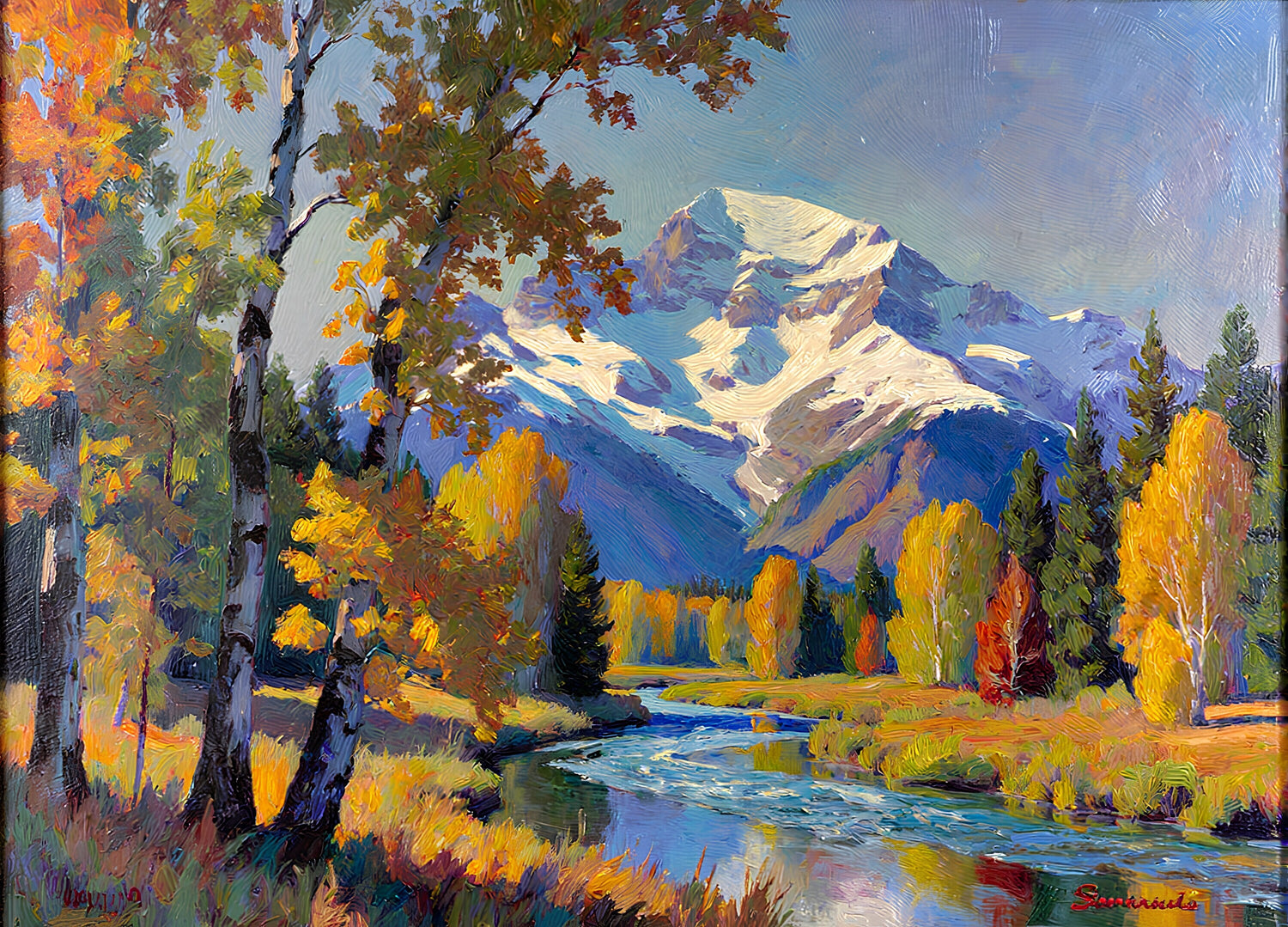 蛇行した川の向こうに冠雪した山がみえる。
