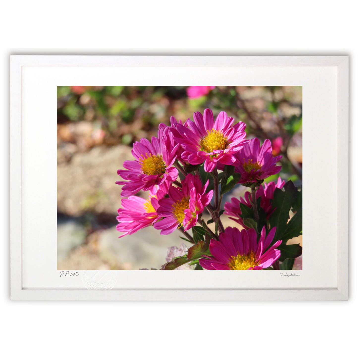 あゆわらの企画・制作・販売の作品。 画用紙のような質感の高級アート紙を採用。 発色が豊かなので繊細な色を忠実に再現。 印画紙ではないので、絵なのか写真なのか迷う不思議な印象です。 紙に光沢がなく、光を反射しないので、 蛍光灯の光で作品が見えづらくなることもありません。 色の再現性もこだわりました。 色調整は、最新技術で厳密に行うことが出来ます。正確に色を再現できるデジタル印刷で一枚一枚制作。 品質をチェックし、合格したものにあゆわらのエンボス印を入れて完成となります。