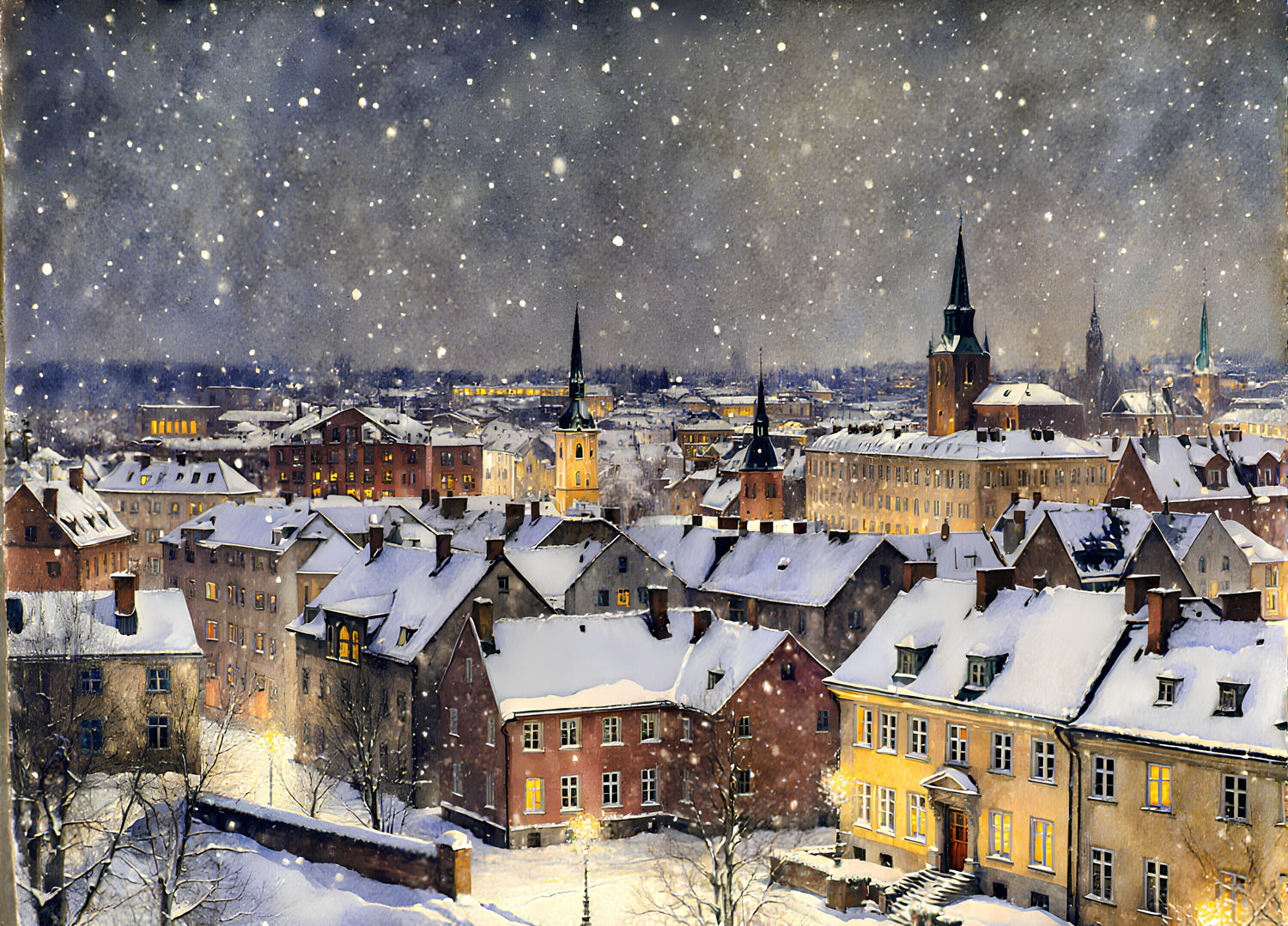 スウェーデンのある都市の冬の風景。雪の降る寒い夜です。