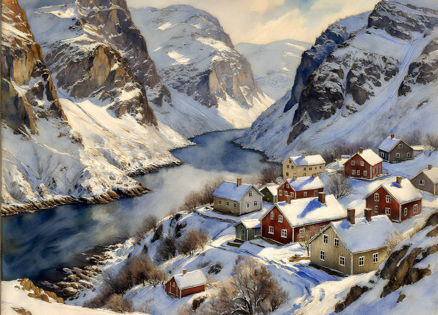 雪の積もったフィヨルドの雄大な風景を水彩画で表現しました。