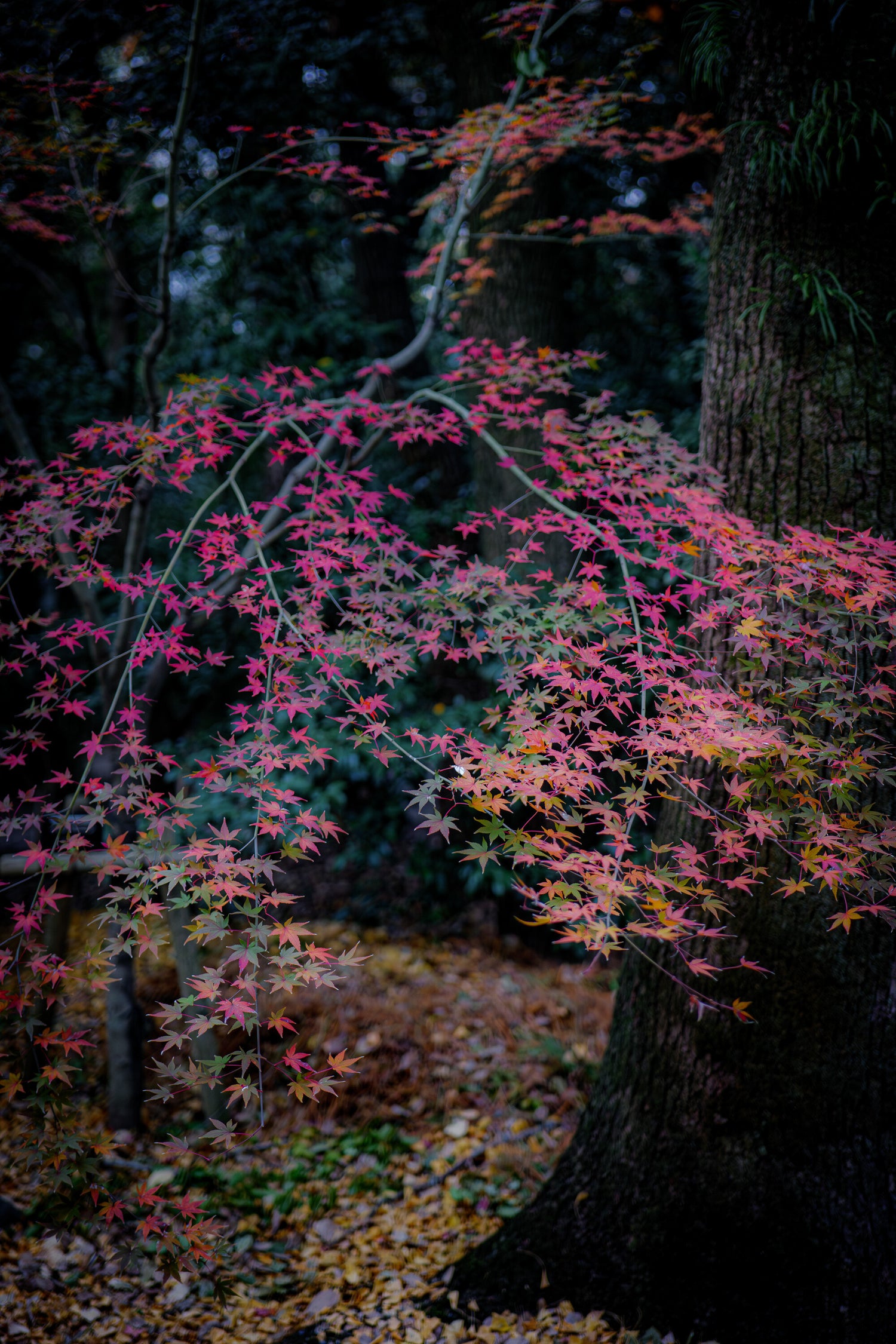 愛知県名古屋市にある熱田神宮…木々が生い茂る冬の境内でまもなく日没を迎える頃、繊細な光のもとで色付く紅葉の枝を見つけた。