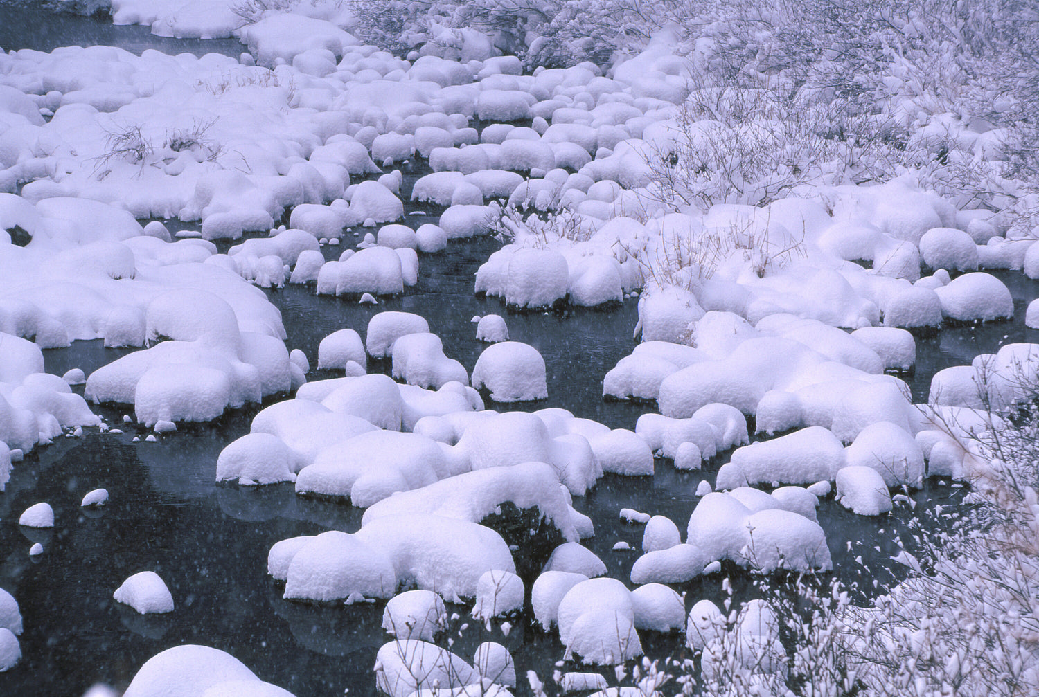 川の岩の上に降り積もった雪が印象的。速めのシャッターで雪を写し止めています。