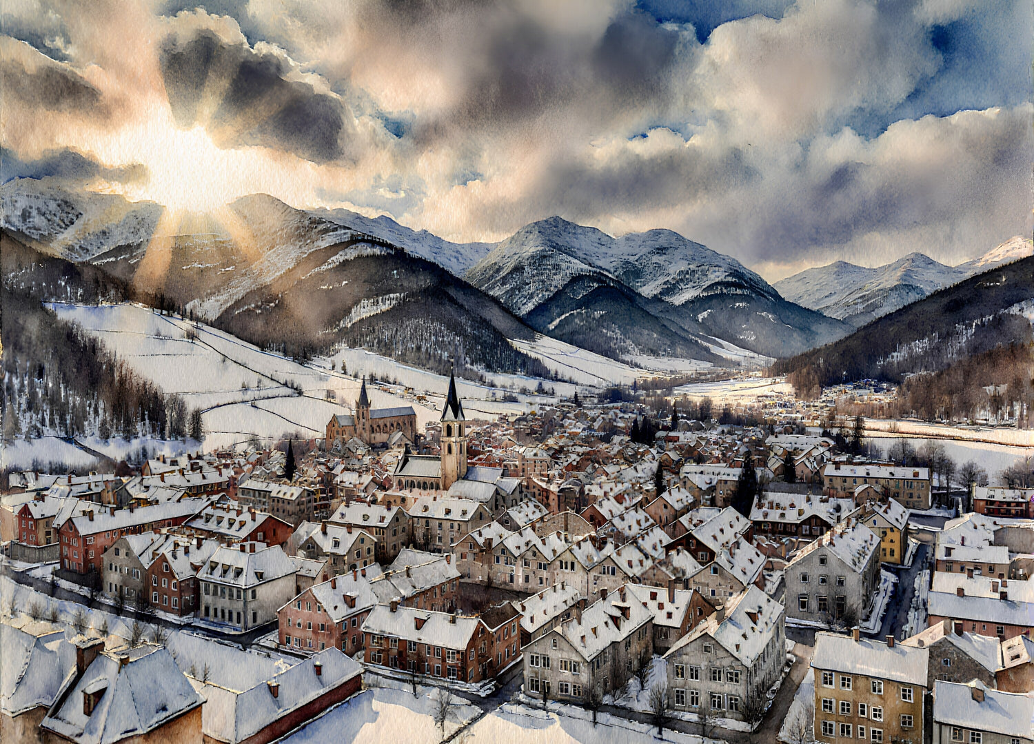 山に囲まれた町に雪が降りました。今朝は朝日が差しています。