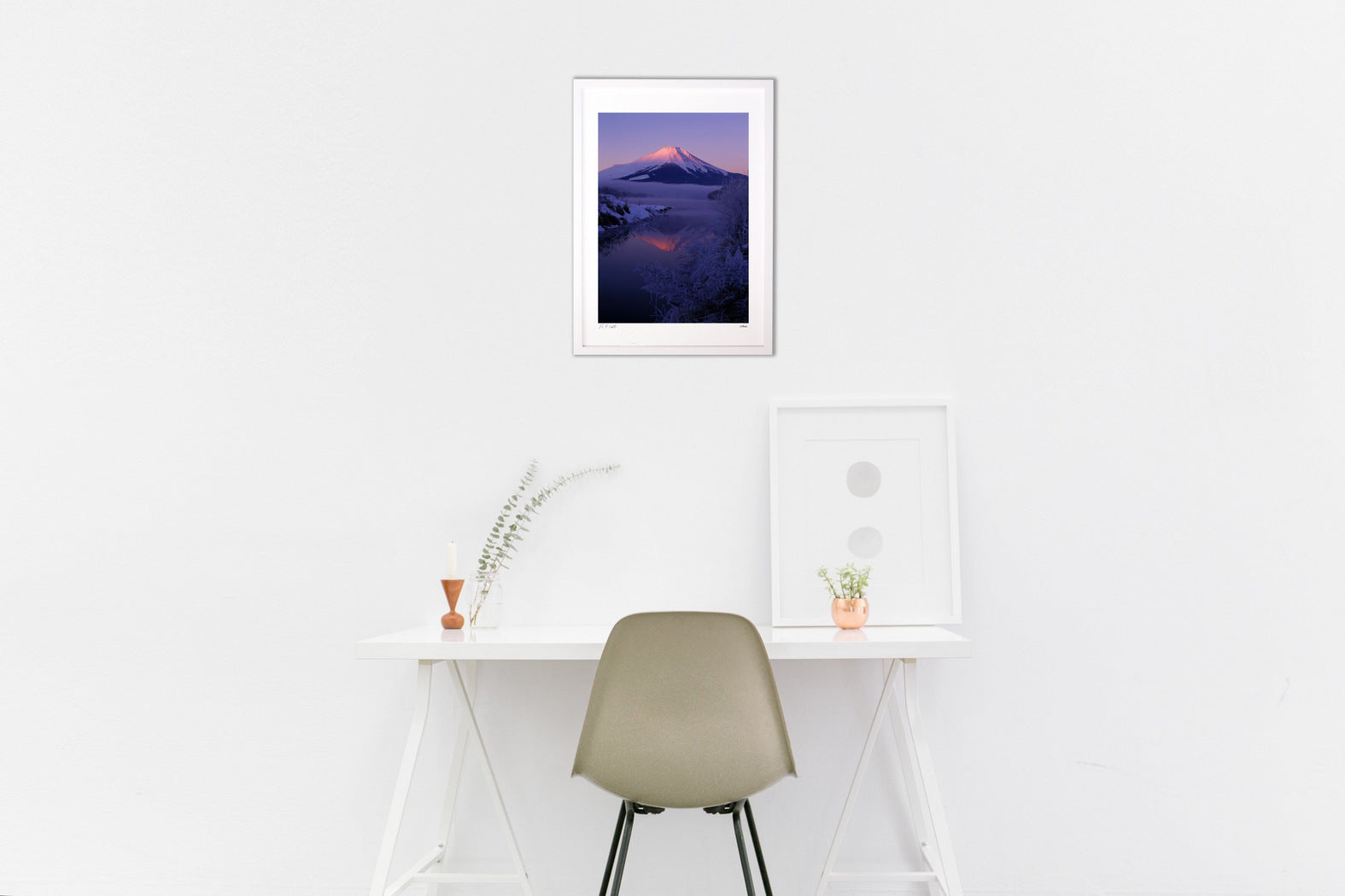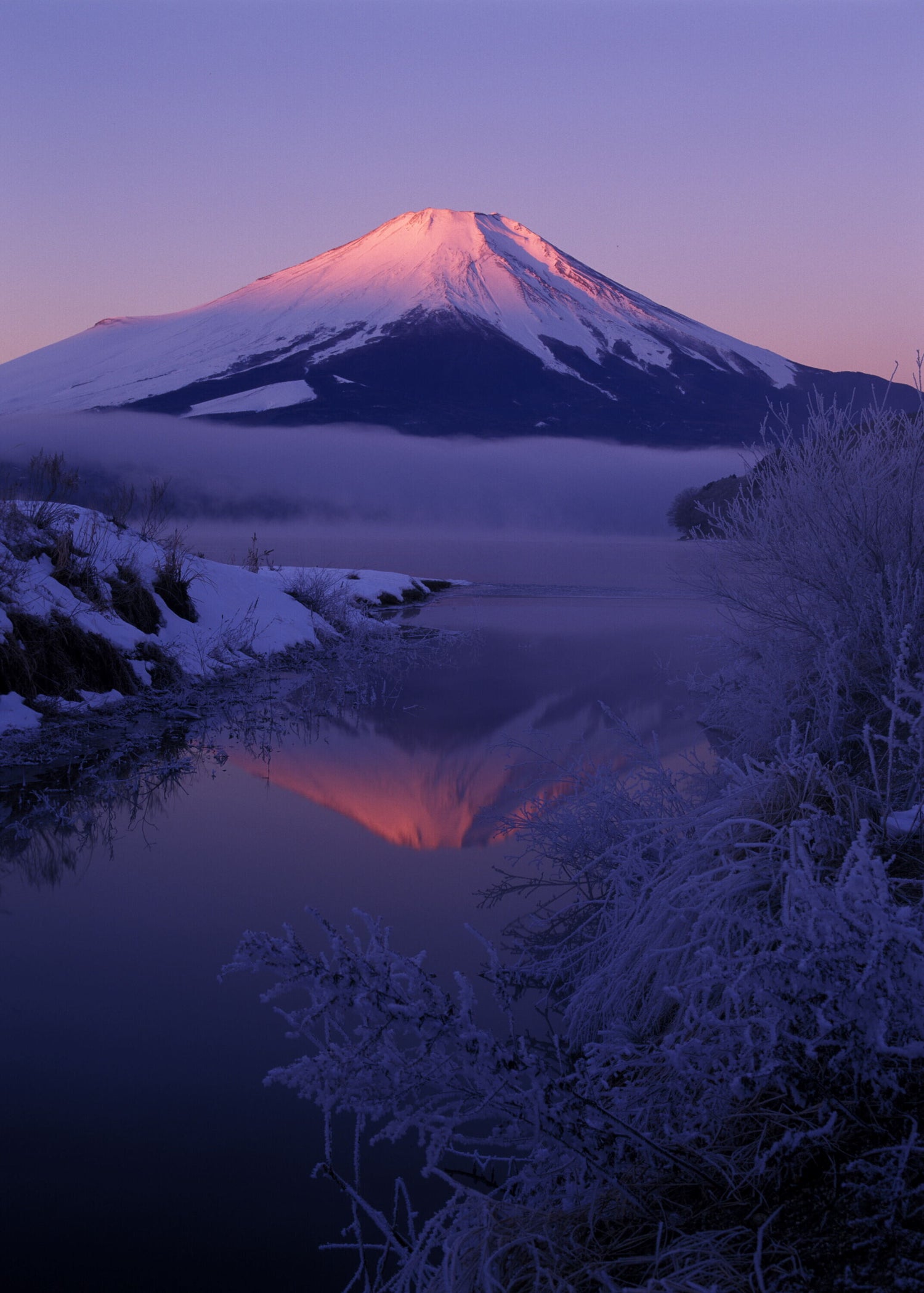 山中湖に逆さ富士が投影する。極寒の朝 富士山の頂上付近が赤く染まるのを待って 湖に投影する富士山を構成したものです。辺りの草木は霧氷に覆われていた。
