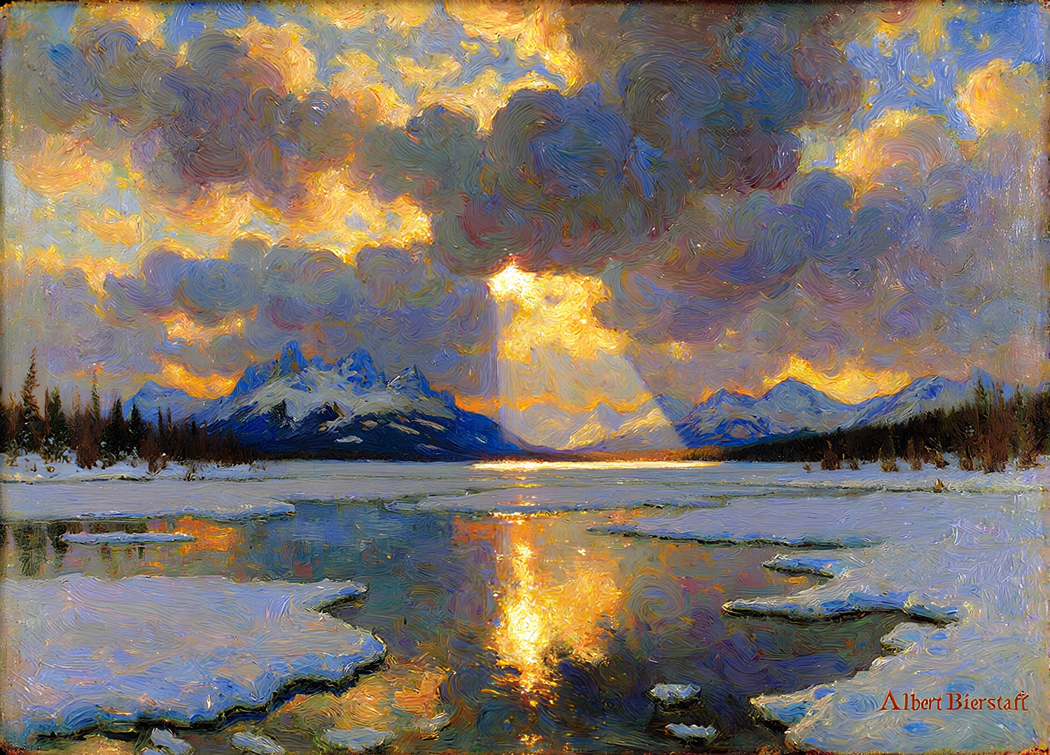 雲を貫く一筋の太陽光線が氷の表面に反射し、遠くの山々が光り輝いている。