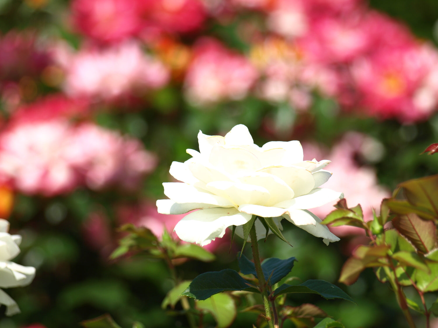 背景のぼけたピンクのバラは「優しさ」と「愛情」の色彩を添えます。