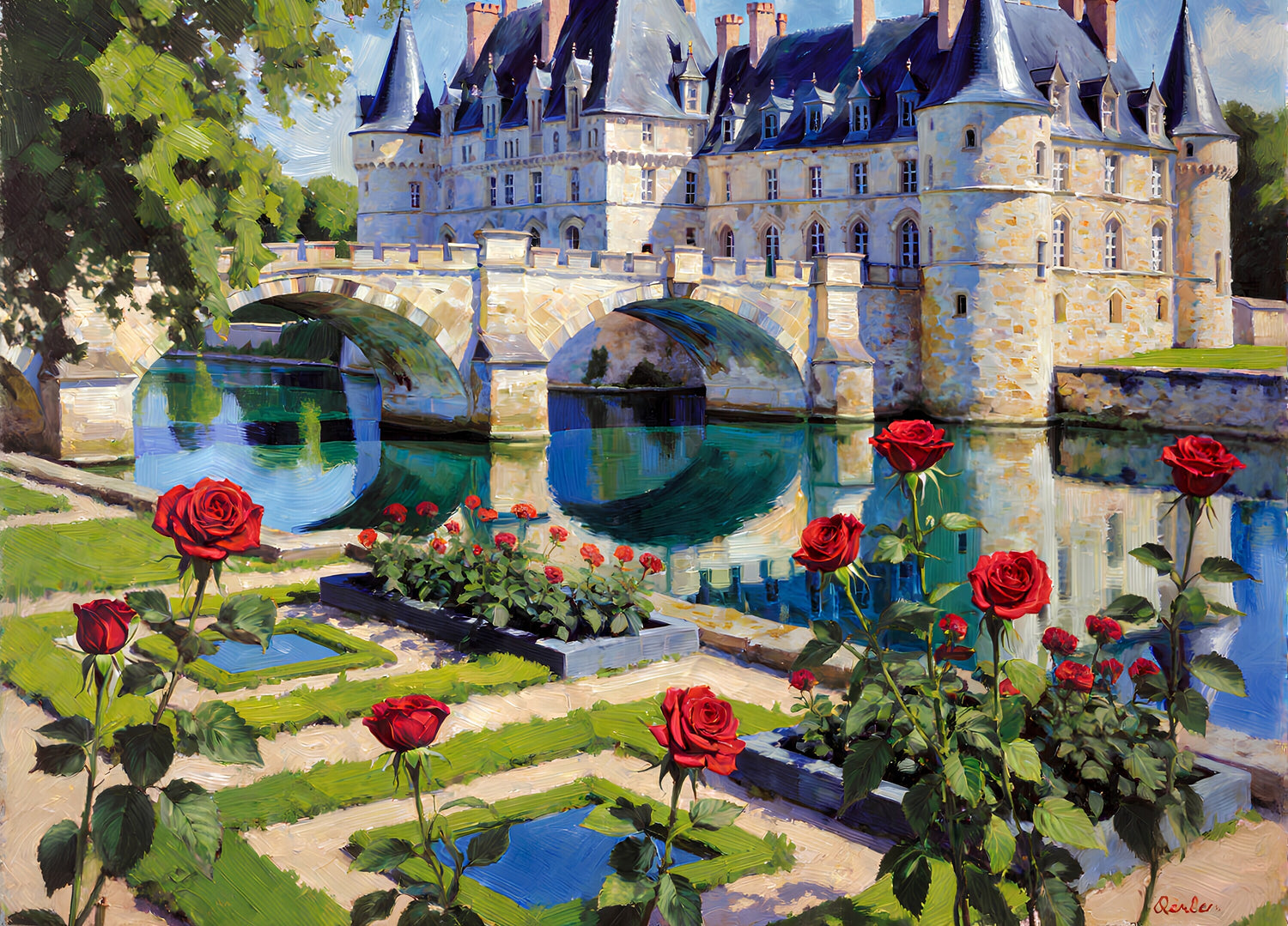 整形式庭園はエメラルドとライムグリーンで表現され、幾何学的な花壇には赤いバラが咲いている。