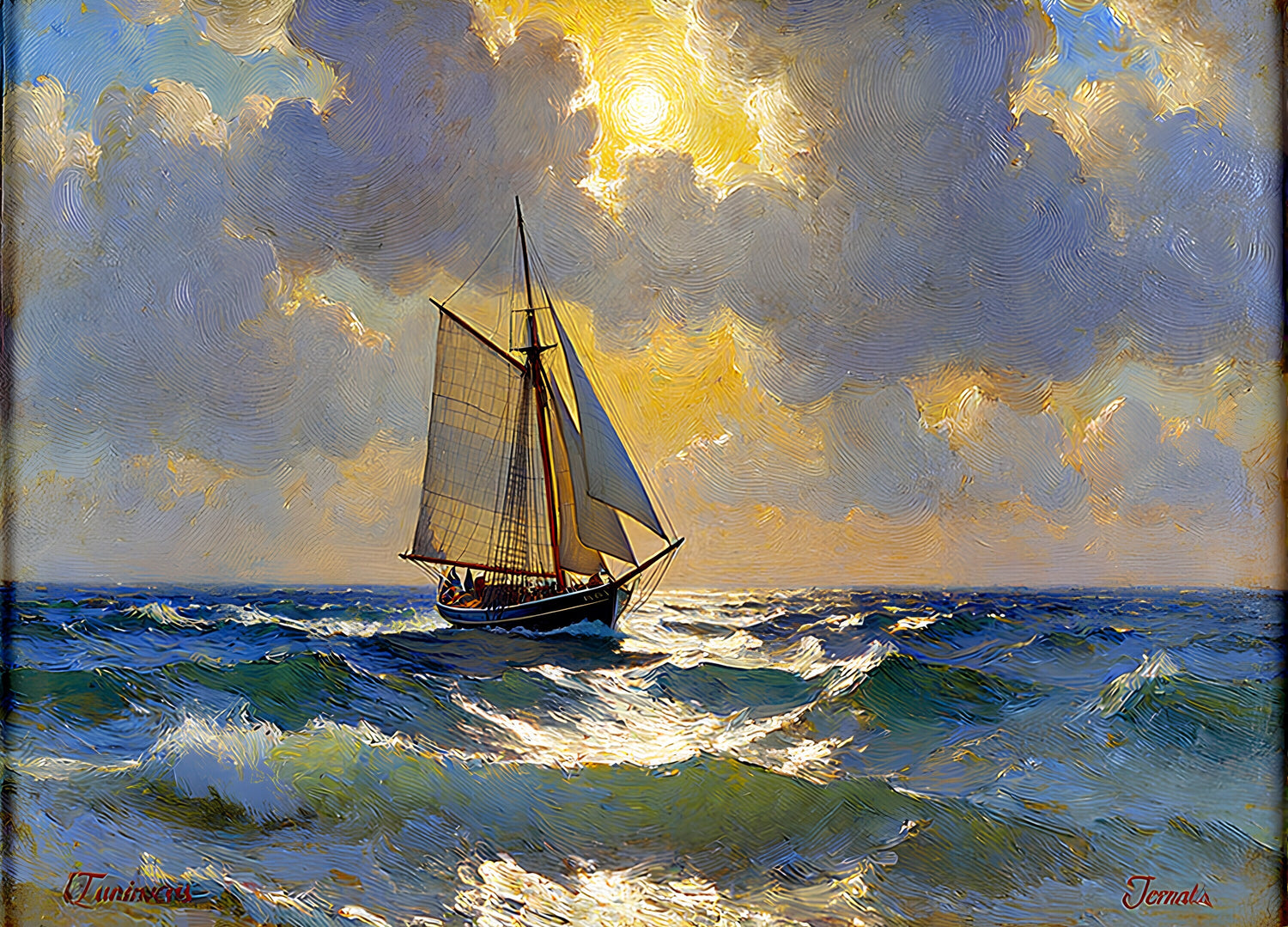 爽やかな風が吹き、ボートが朝日に向かって進んでいる。
