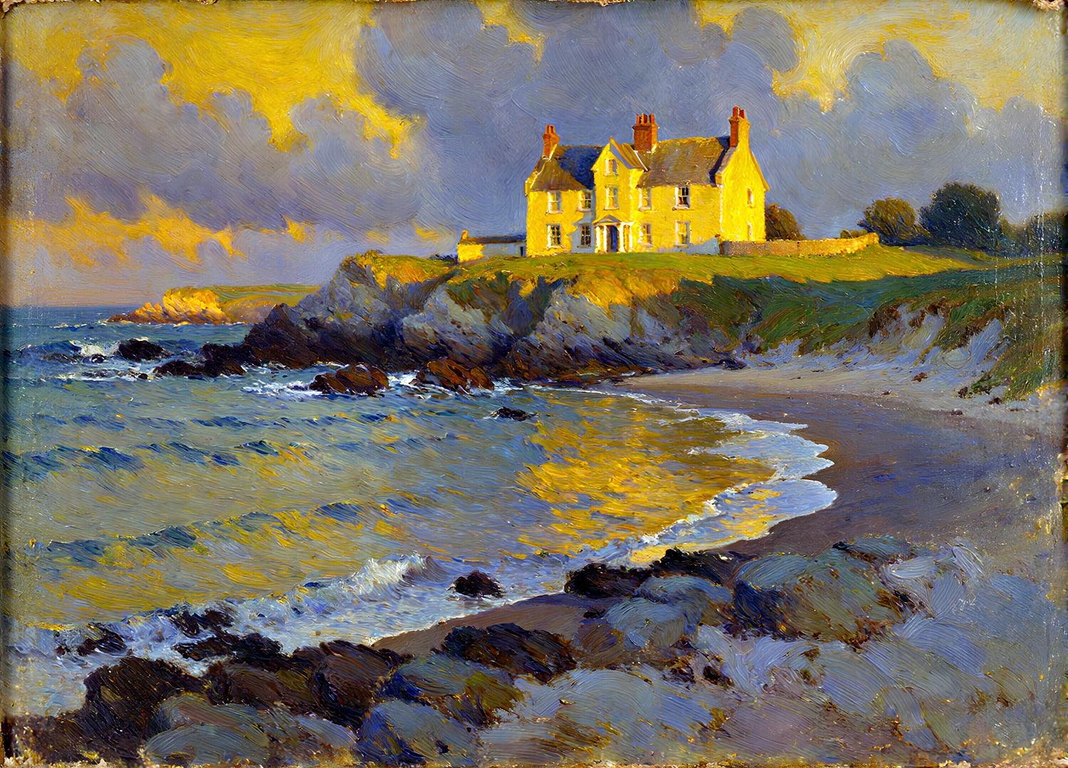 海岸の少し上に建っている家が夕日を浴びて黄色く輝いている。