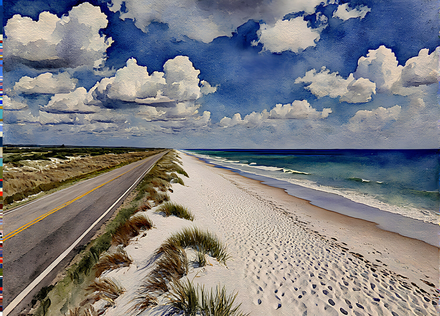 道が海岸に沿ってまっすぐに続いています。海も空も真っ青です。