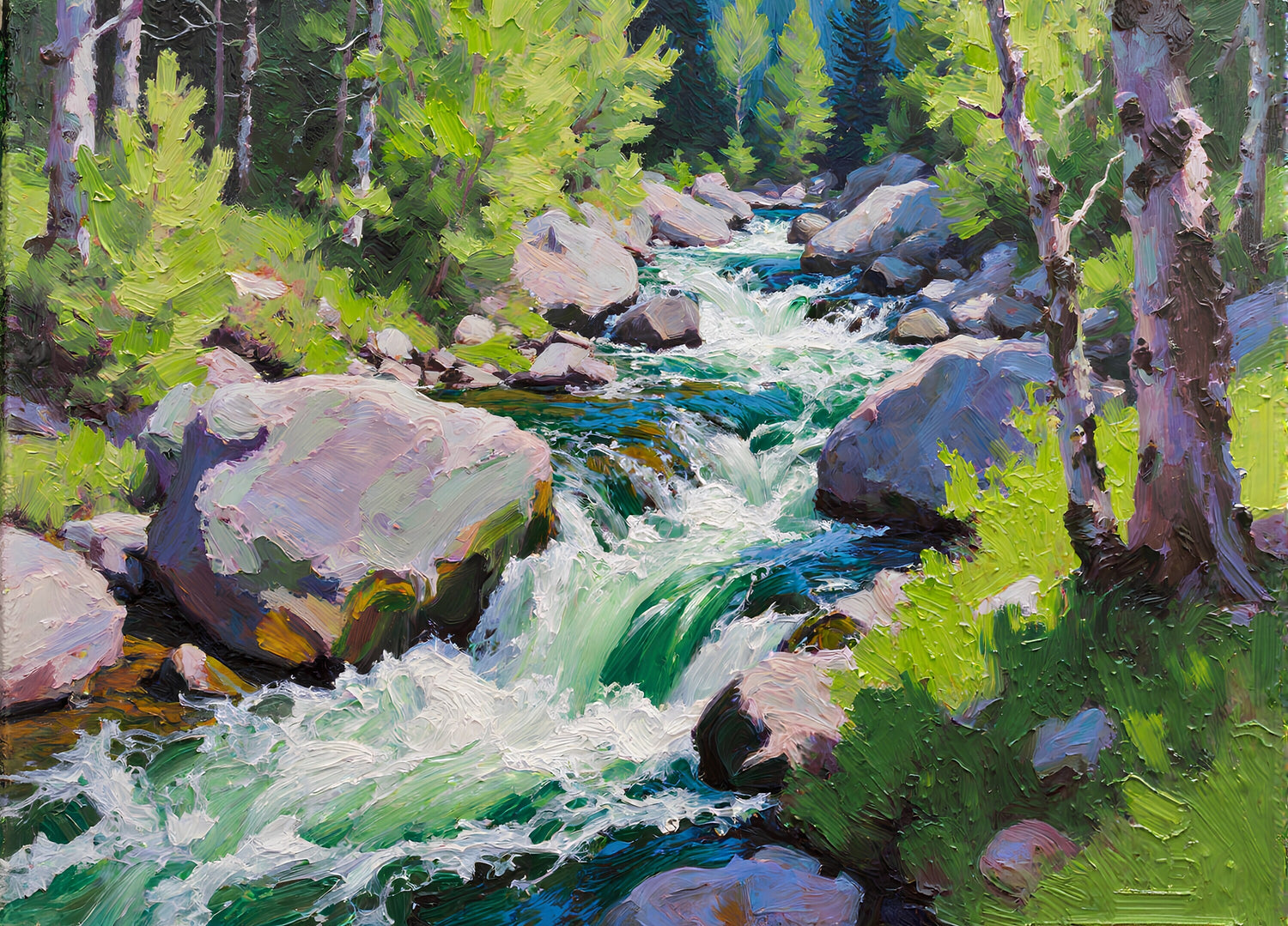 勢いよく流れる水は彫刻のような厚塗りの質感を呈し、白い飛沫が太陽の光を捉えています。