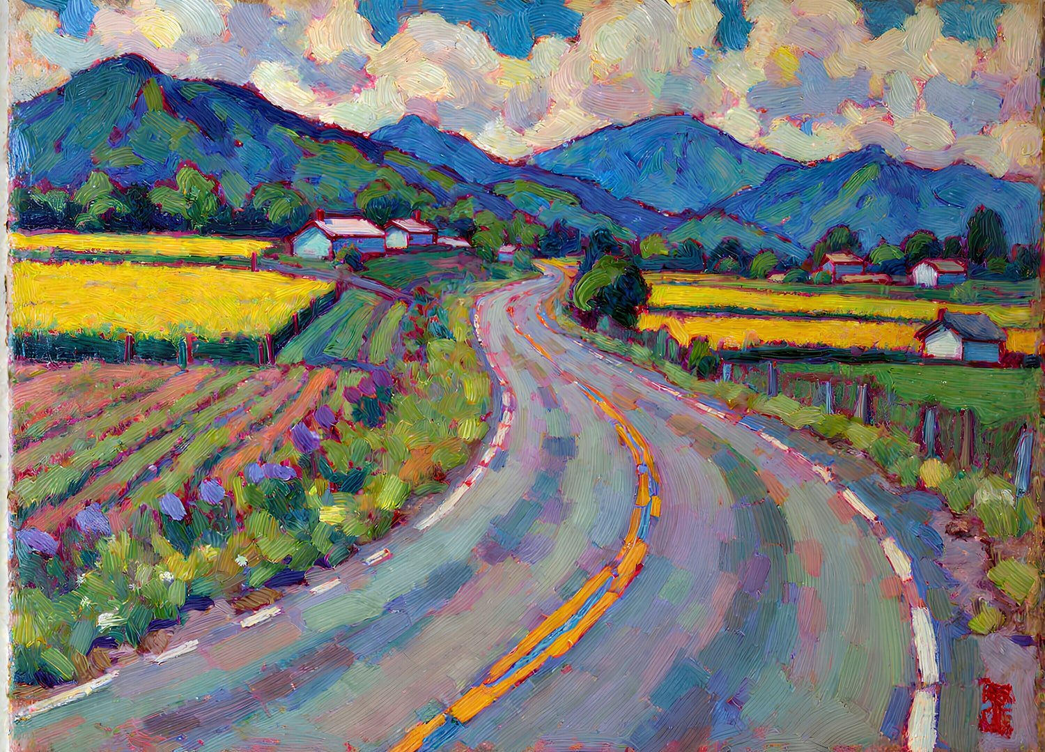 畑の中を通る曲がりくねった道の先に山脈が見える。