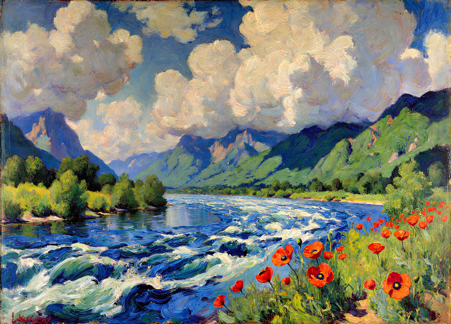 山々は鮮やかな原色の緑に覆われ、川岸には鮮やかな赤い原色のポピーが点在している。